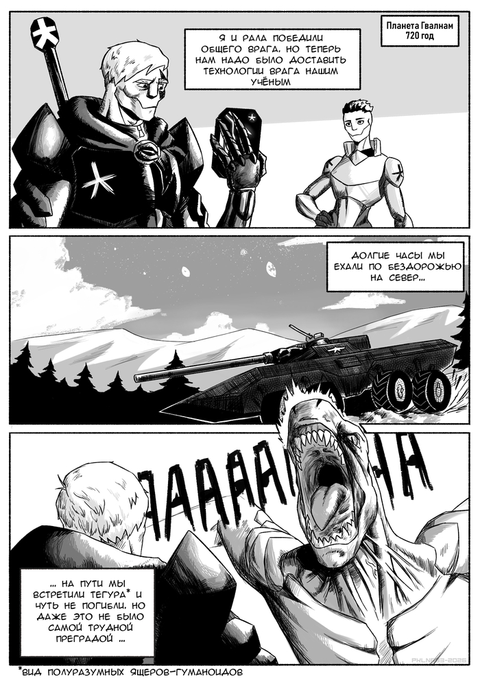 Вчера в чате моих коллег по комиксам я опубликовал страницу с готовым лайном третьей главы моей манги "Хранитель Гуррала" [она про войну двух рас инопланетян, одна уже десятки лет с танками и самолётами, а другая только-только эти технологии открыла]. Там был комментарий, который на первой странице про то, что подруга гг - это парень, и что раса гвалов похожа на турианцев. Автор коммента данный комикс оценила)