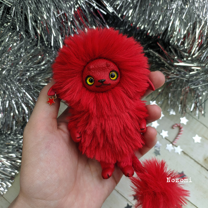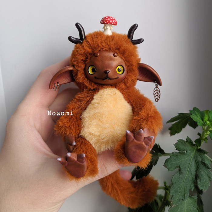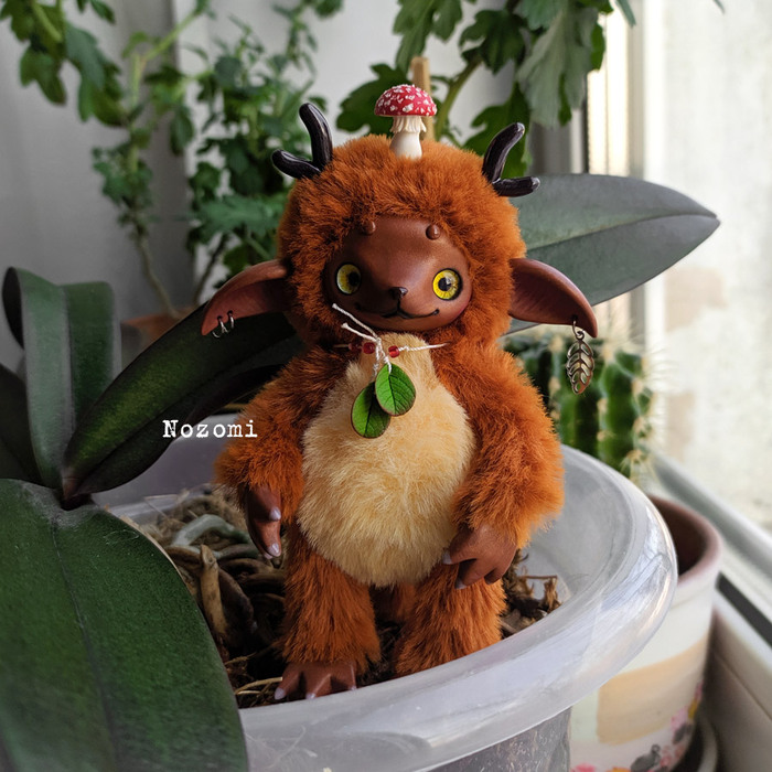 Сделан из полимерной глины и искусственного меха. В хвостике проволока и его можно сгибать. Так же хранитель может вполне уверенно стоять, опираясь на хвост. Голова и лапки подвижны. Рожки покрыты ультрафиолетовой смолой с мелкими блестяшками. На фото этого не видно, но в реальности рожки очень красиво переливаются.