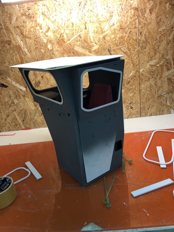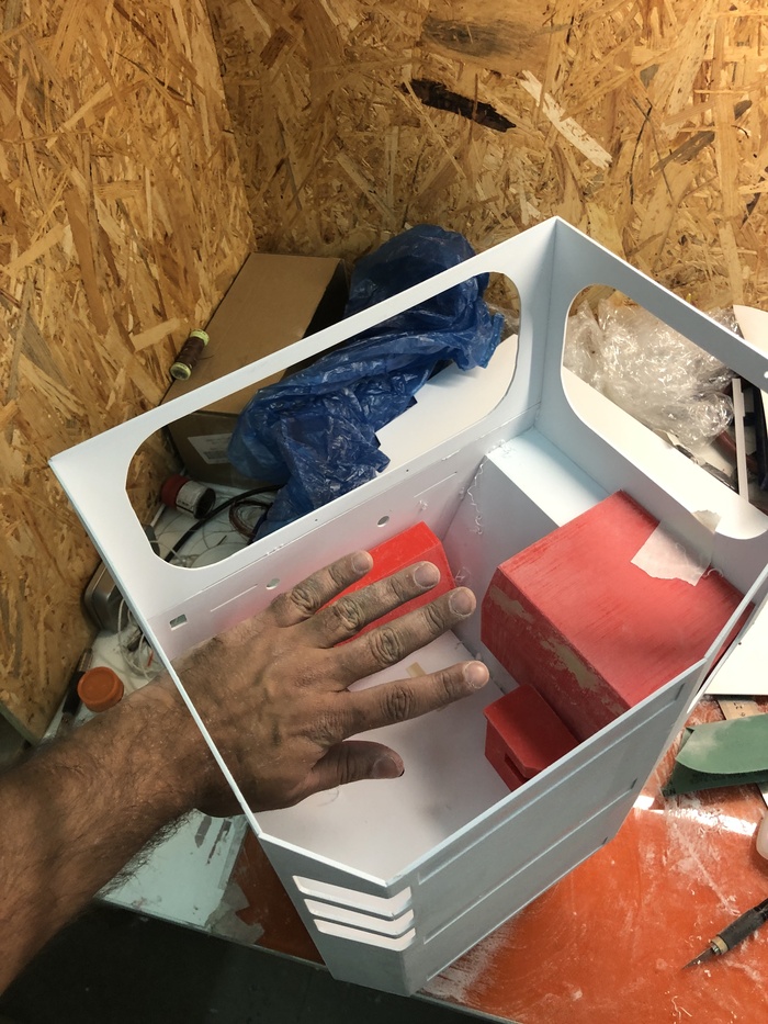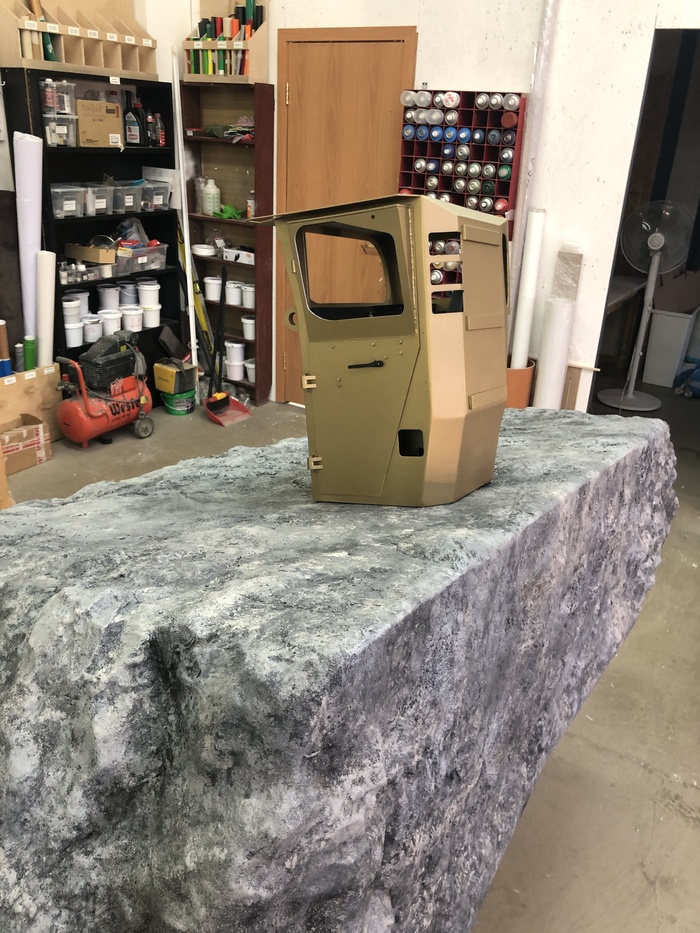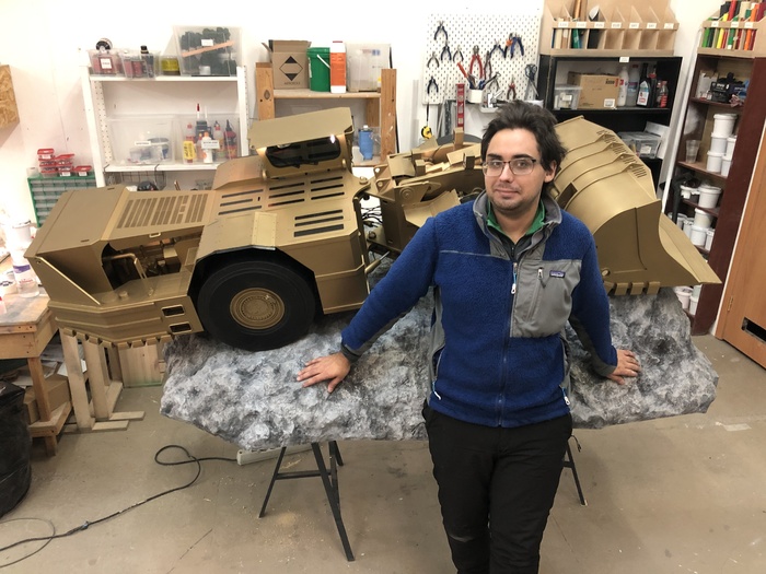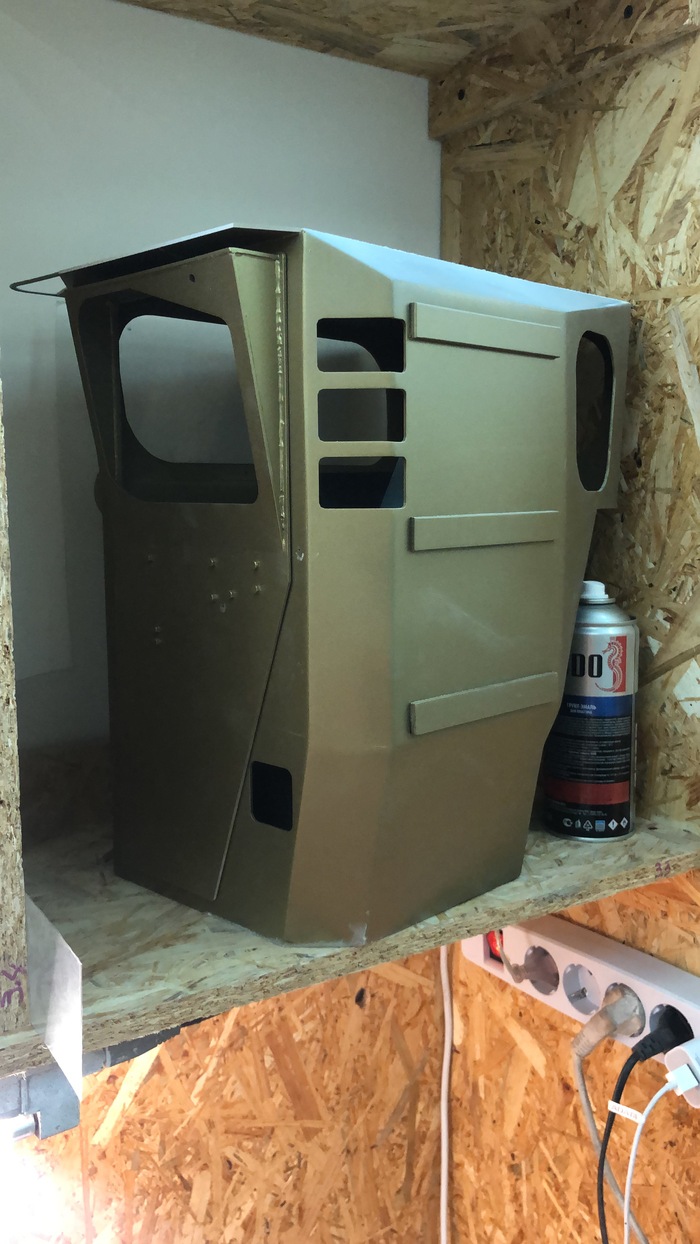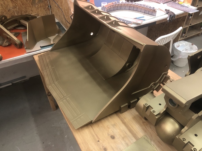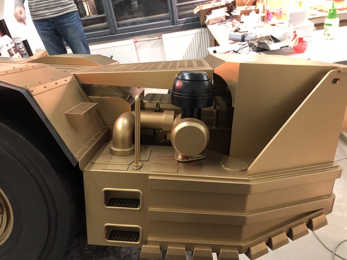 Так как поргузчик был огромного размера, то в качестве основного материала было решено использовать ПВХ и FDM печать, в ином случае детали получались бы неподьемными либо по весу, либо по цене. Единственное, где в использовался полистирол - это кабина, которую делал я.