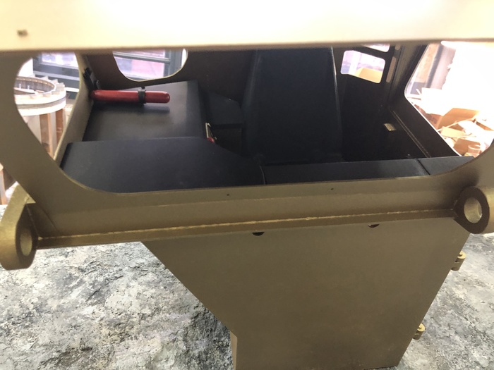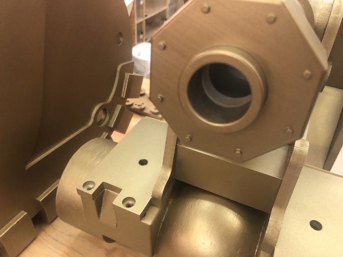 А потом пришла пора окрашивать и собирать все воедино. Пришлось сделать достаточно мощные вставки, что бы модель не распалась под собственным весом. Но в итоге в се получилось. Отдельно хочется упомянуть окраску - я не знаю, что заставило заказчика потребовать именно золотой оттенок, но, на мой взгляд, получилось не слишком. Ну и общая особенность таких моделей - отсутствие затенения и следов эксплуатации ( хотя первое, в принципе, не так важно из-за масштаба.)