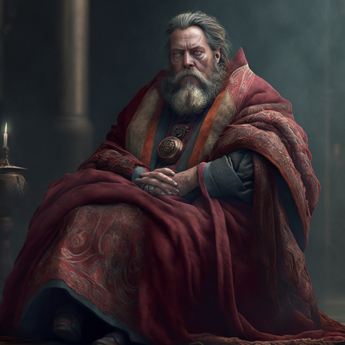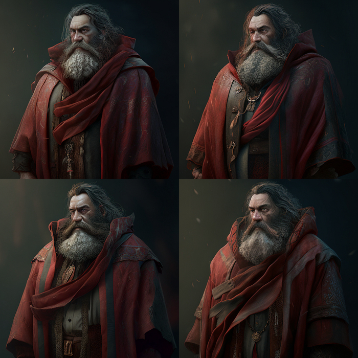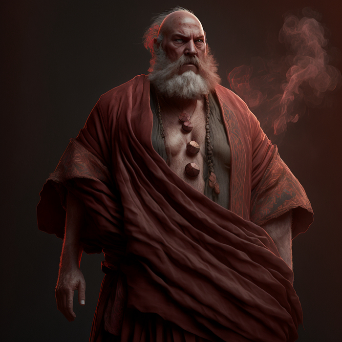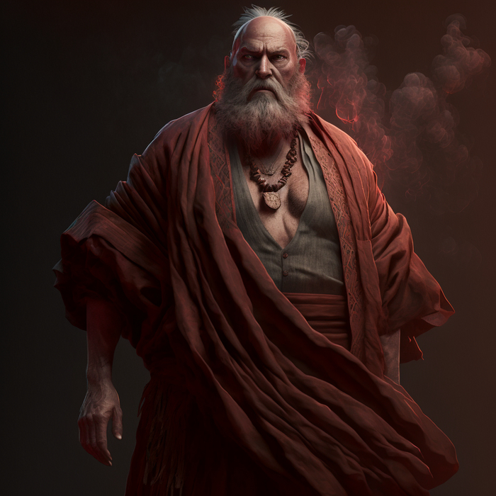 Запрос: "Male, Bearded, Giant, Crimson silk clothing, Large build, Heavy muscles, Smoking cigar, Approximately 50 years old, Мрачный, long mantle, long poncho, long nightgown, hyper realism, highly detailed, Unreal Engine 5, octane rendering"