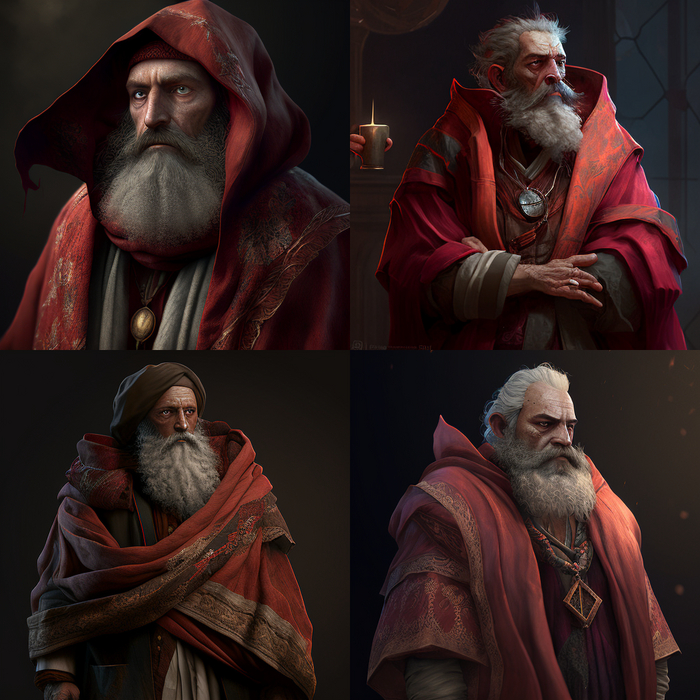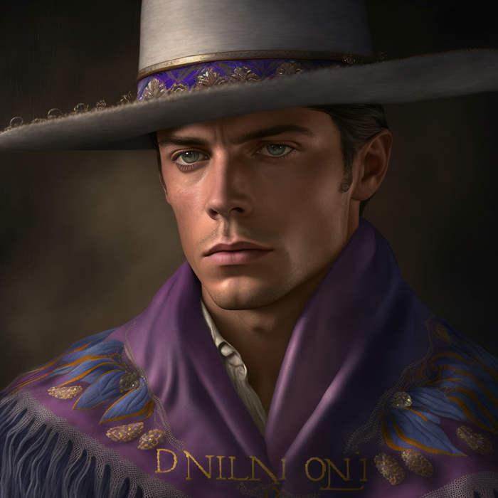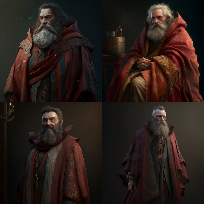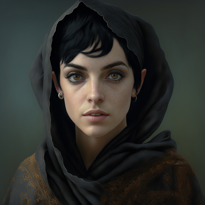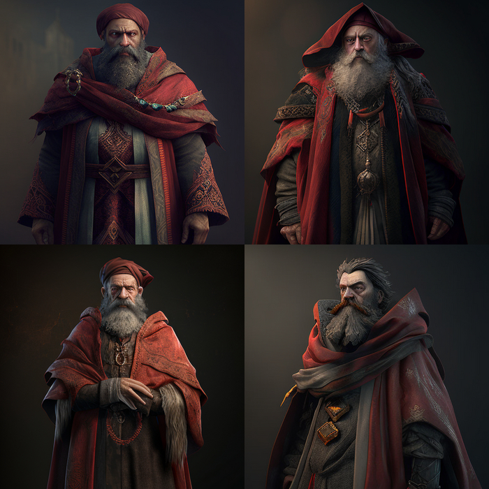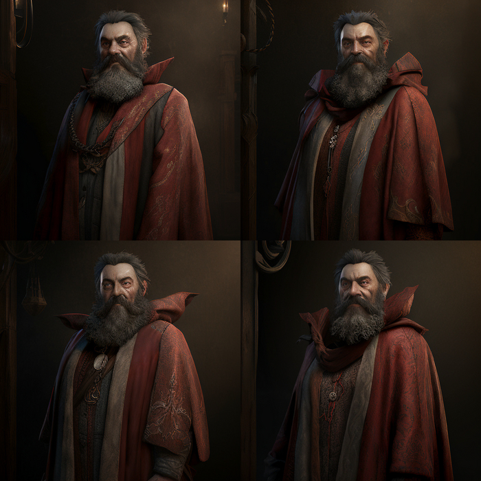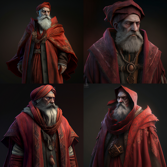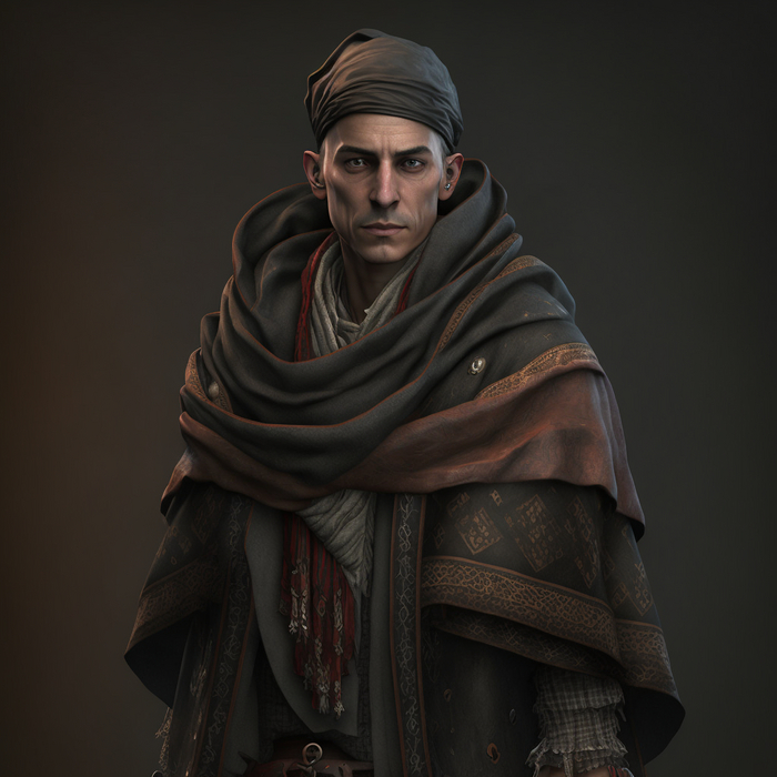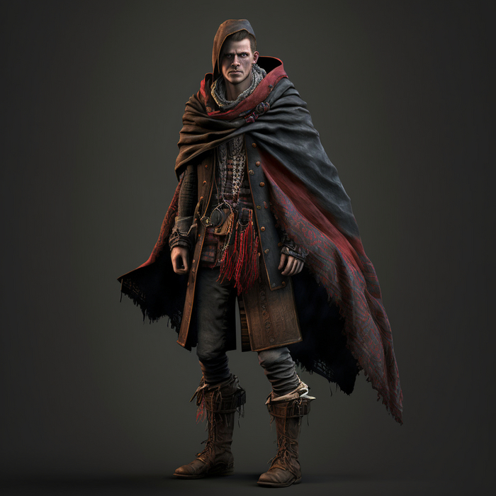 Запрос, если не считать мелких правок по ходу действия, был следующим: "short, thin, man, clean shaved, no beard, no facial hair, in his 30s, withy, luxurious variegated shawl on his head, pirate style, simple black mantle, poncho to his knees, plaid nightgown to his knees, tall and intricately carved boots, hyper realism, highly detailed, Unreal Engine 5, octane rendering"