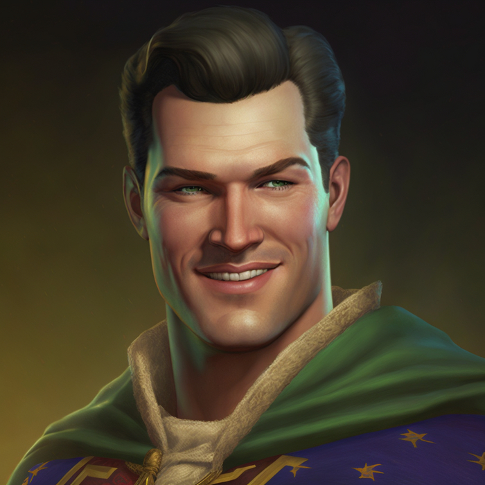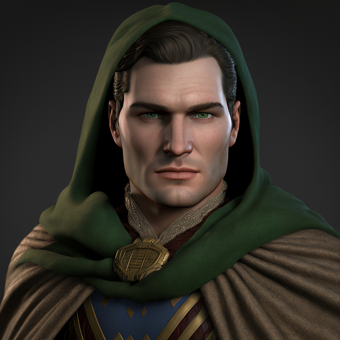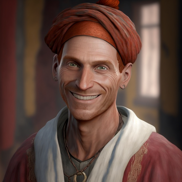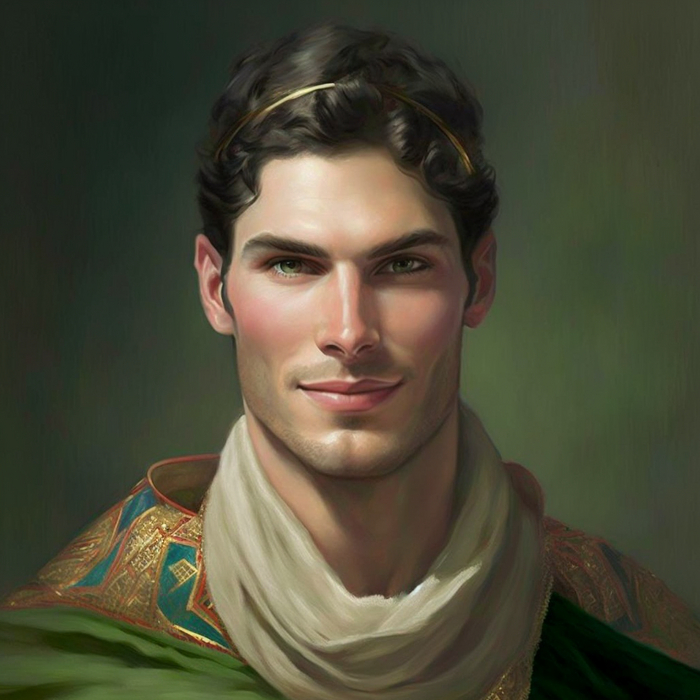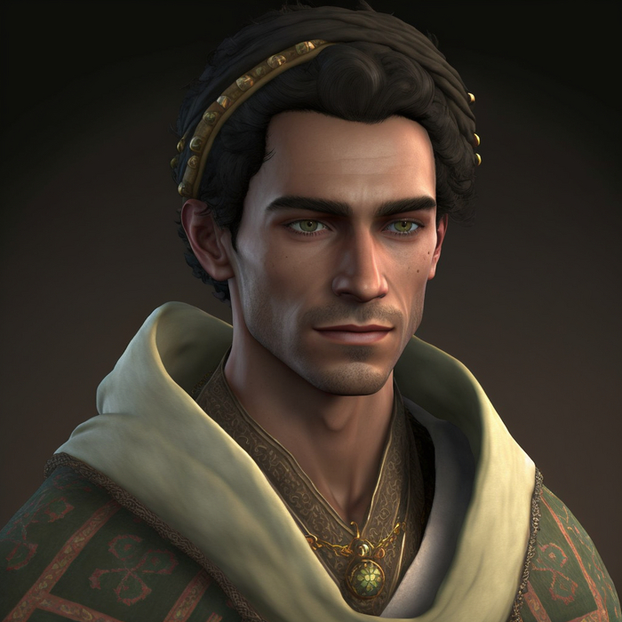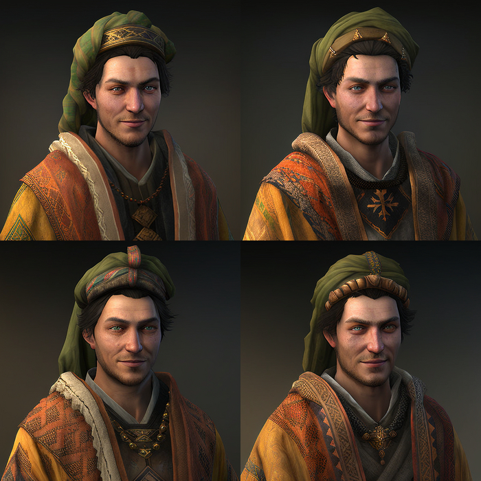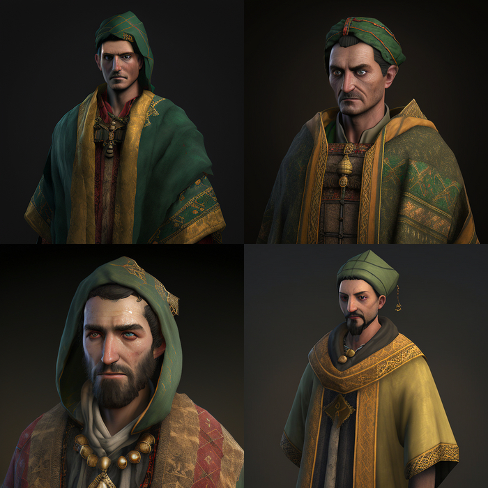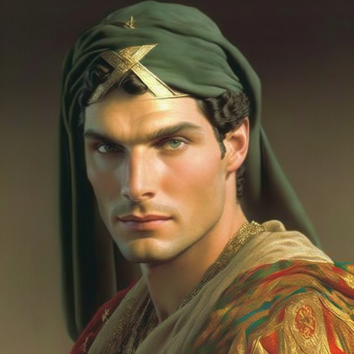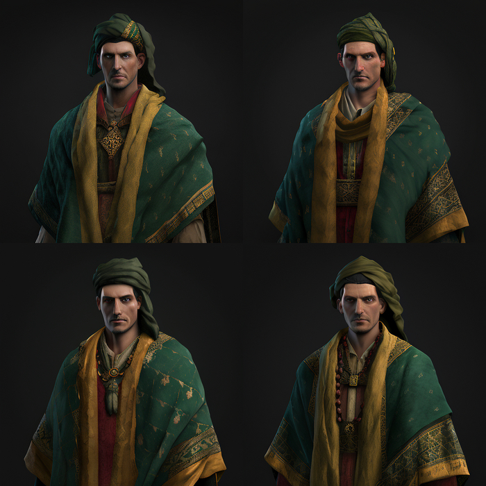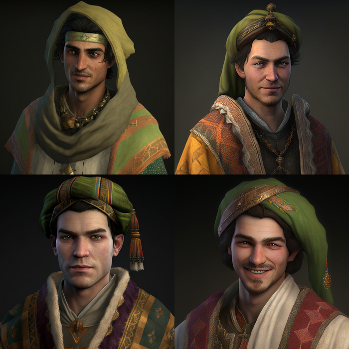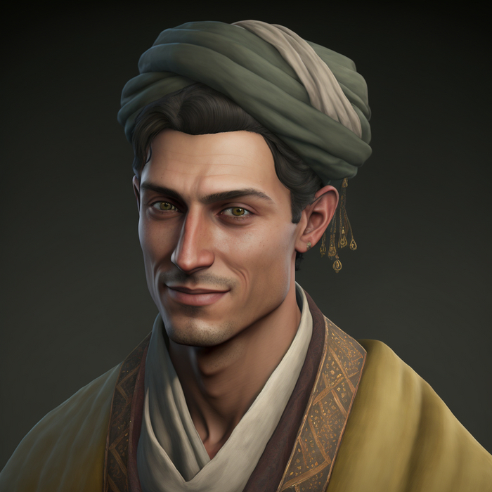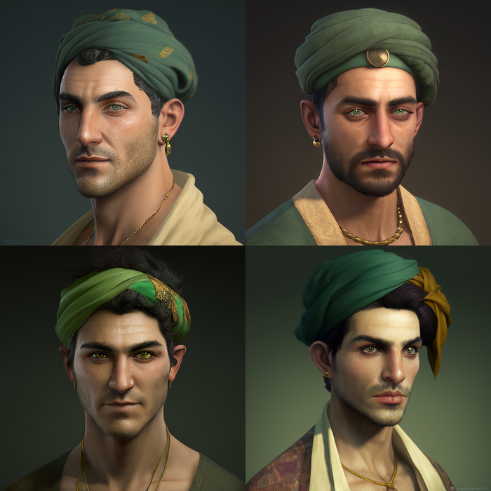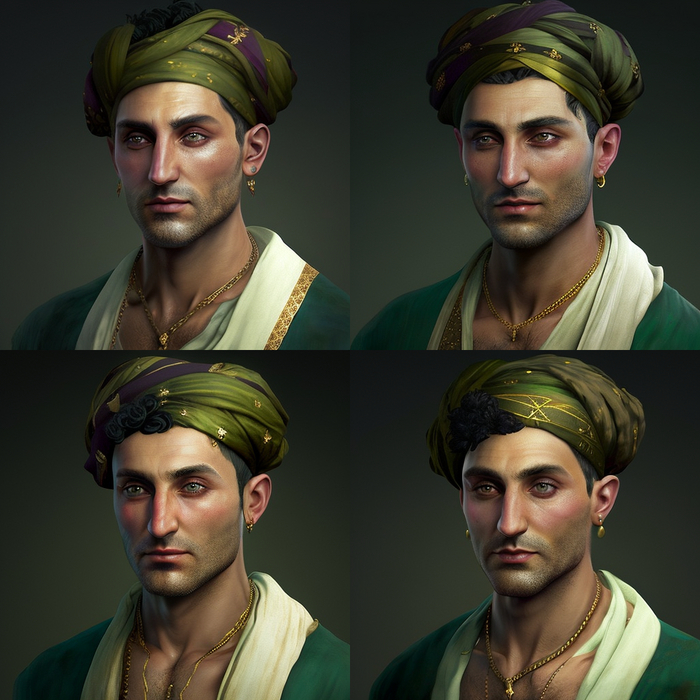 Запрос: "male, caucasian, black hair, approximately 25 years old, smiling, hyperactive, turban, clean-shaven, no facial hair, clothing in gold and green colors, small triangular scar above left eyebrow, six precious earrings in left ear, long mantle, long poncho, long nightgown, hyper realism, highly detailed, Unreal Engine 5, octane rendering"