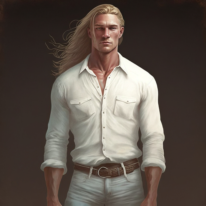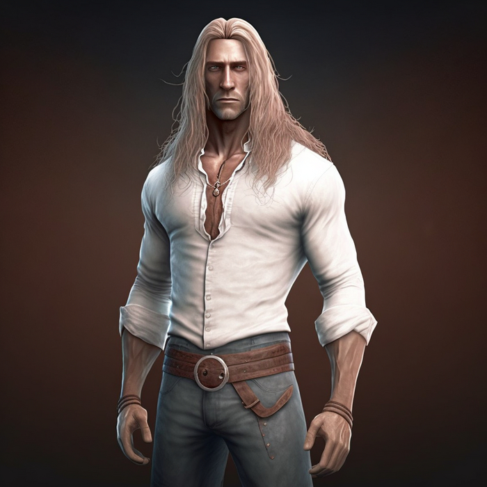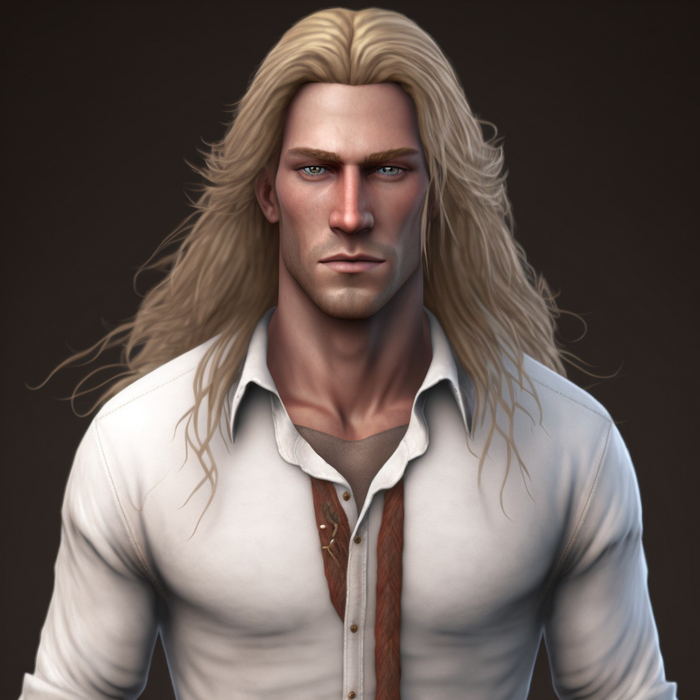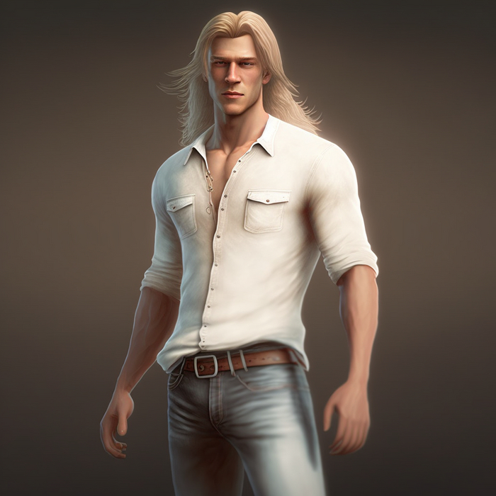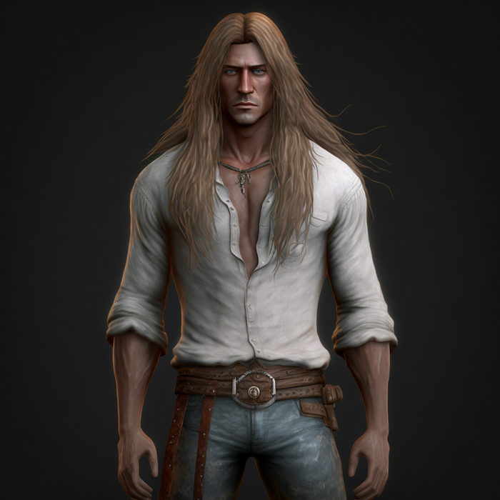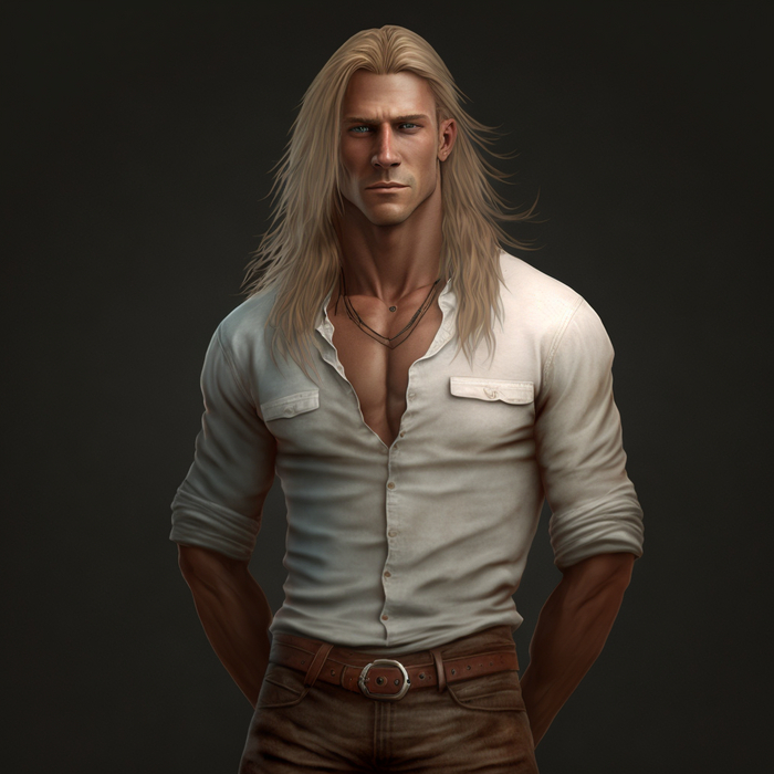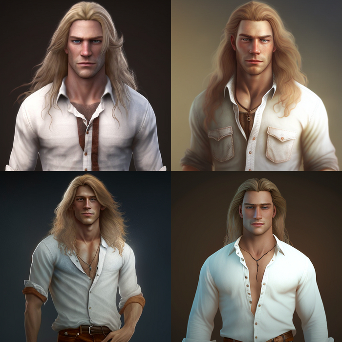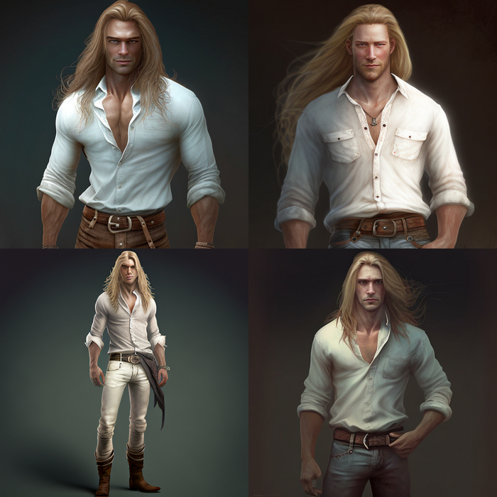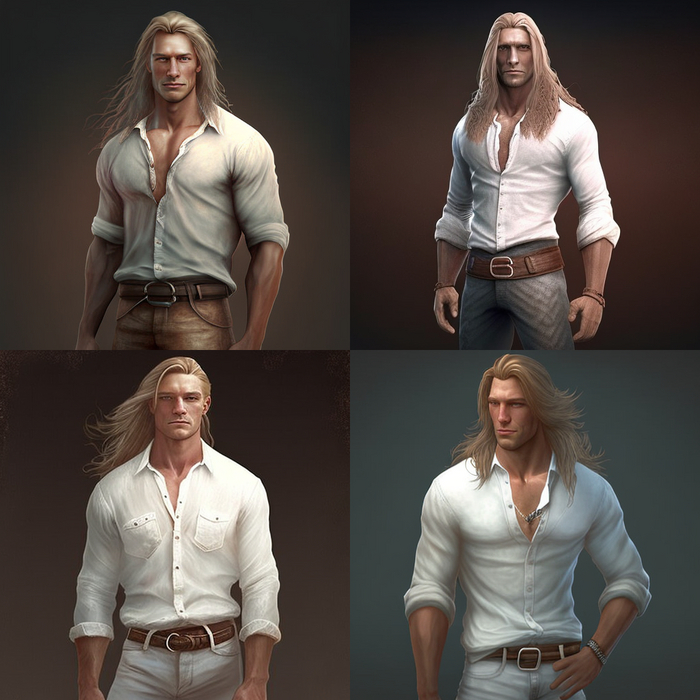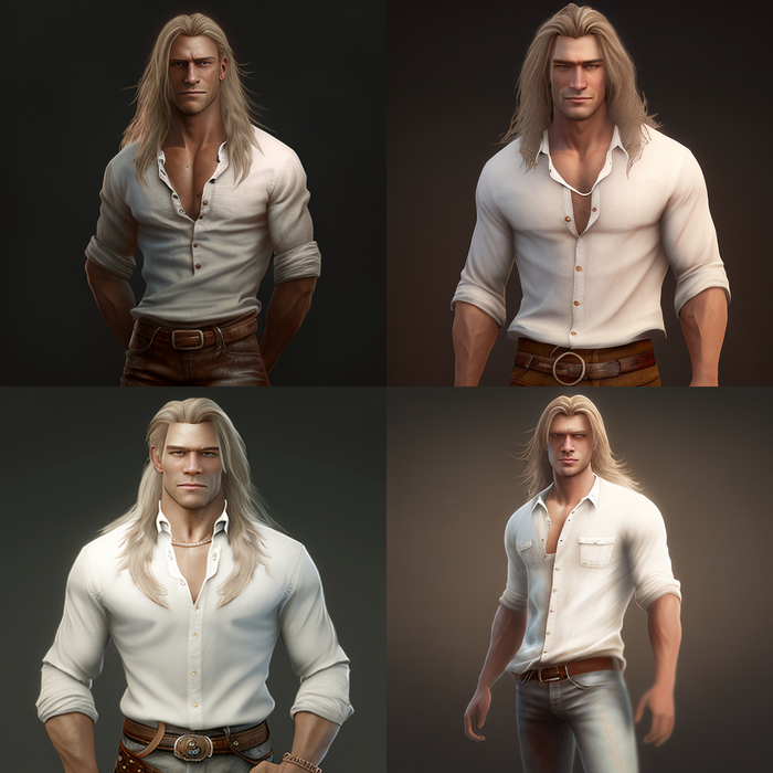 Запрос был таков: "Male, Uncertain Age, Loose White Pants, No Belt, Loose White Shirt Without a Collar, Soft boots of reddish leather; lean, long arms, large and strong hands, Long Hair Bangs, Long Strands of Hair, Very Blond Hair, Face Hidden, hyper realism, highly detailed, Unreal Engine 5, octane rendering"