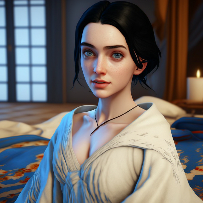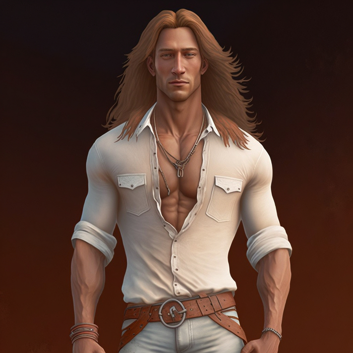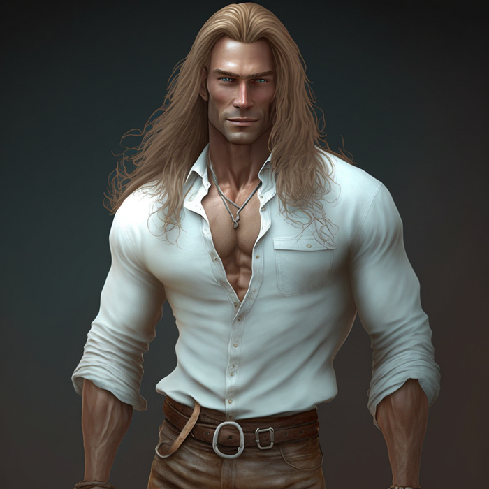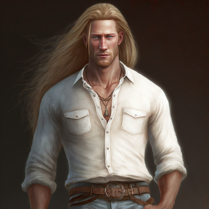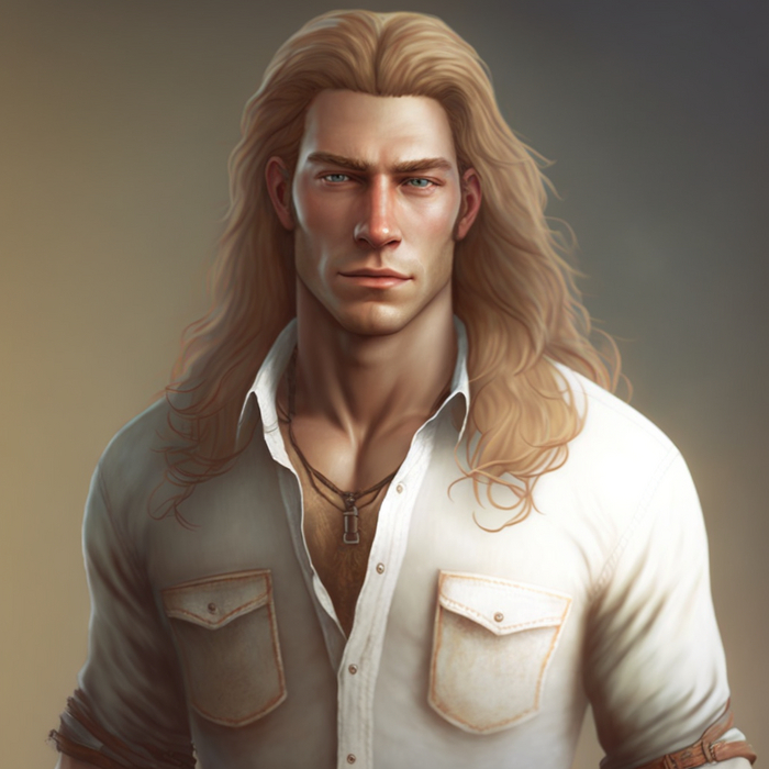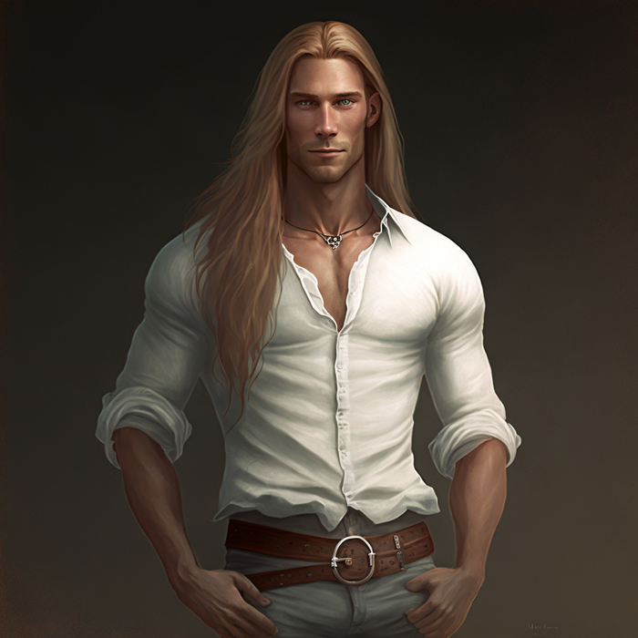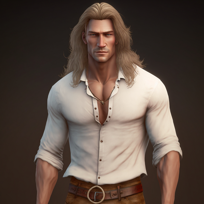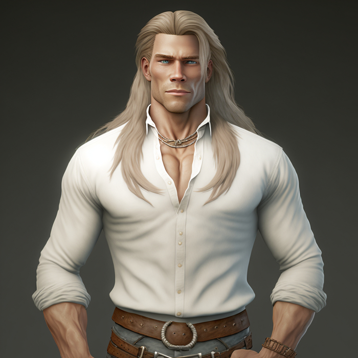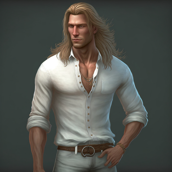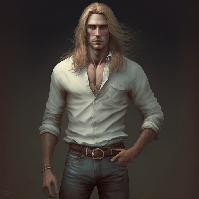 Запрос был таков: "Male, Uncertain Age, Loose White Pants, No Belt, Loose White Shirt Without a Collar, Soft boots of reddish leather; lean, long arms, large and strong hands, Long Hair Bangs, Long Strands of Hair, Very Blond Hair, Face Hidden, hyper realism, highly detailed, Unreal Engine 5, octane rendering"