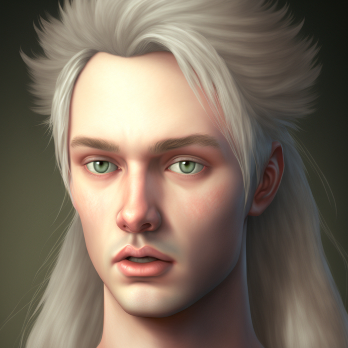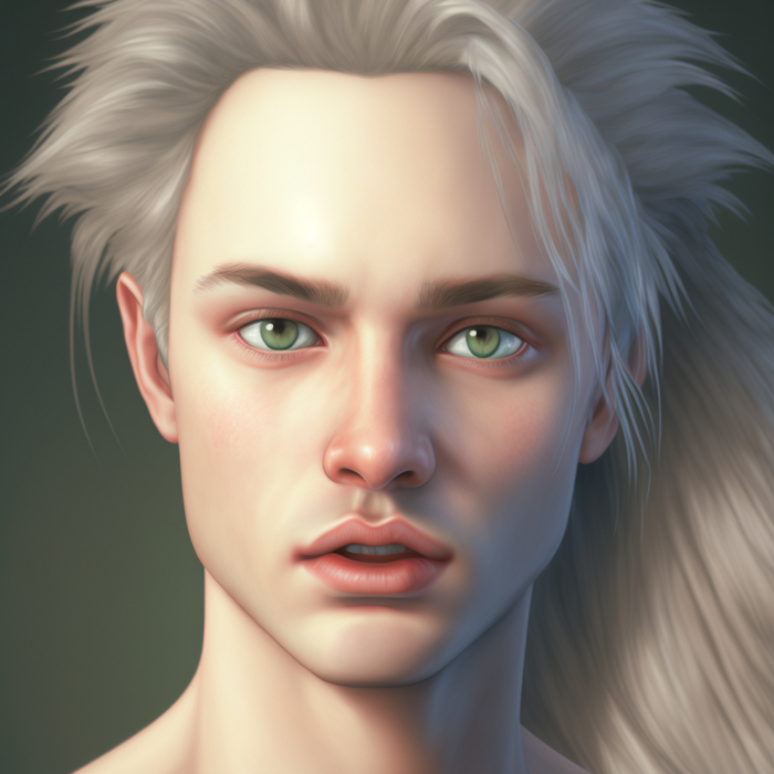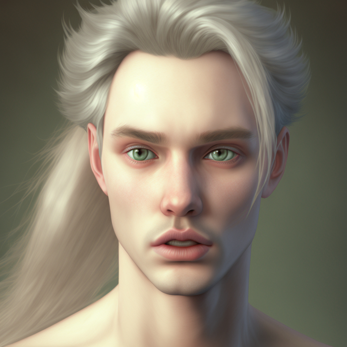 Запрос: "male, caucasian, eight feet tall, extra long hair, snow-white hair, huge yellow eyes, unusually high forehead, amazingly contoured face, prominent nose, small almost childish mouth, hyper realism, highly detailed, Unreal Engine 5, octane rendering --no beard