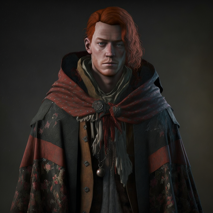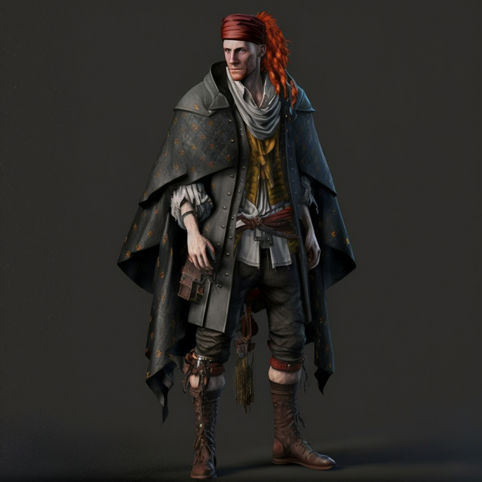 Запрос: "male, caucasian, short, thin, long red hair, clean shaved, in his 30s, withy, long luxurious variegated shawl on his head, pirate style, simple black mantle, black poncho to his knees, plaid coat to his knees, tall and intricately carved boots, hyper realism, highly detailed, Unreal Engine 5, octane rendering --no beard"
