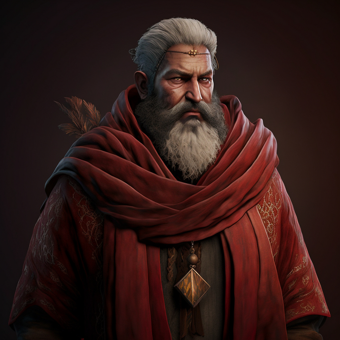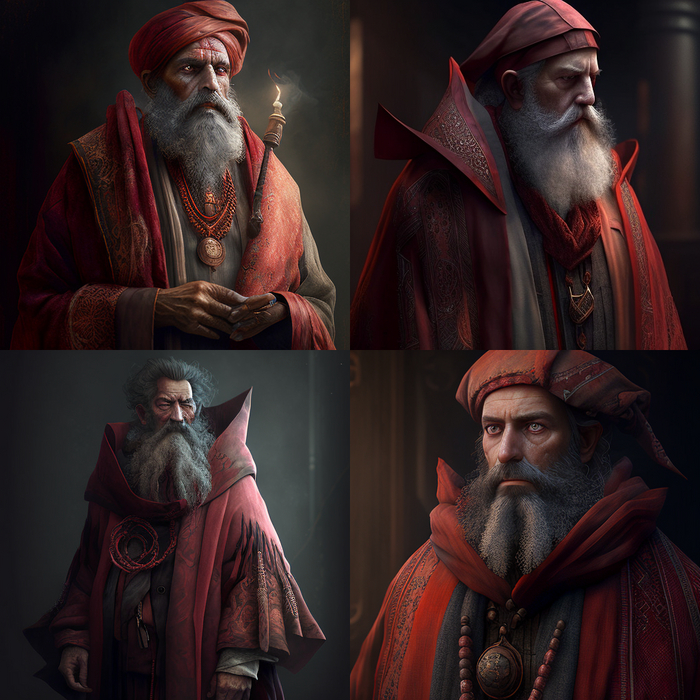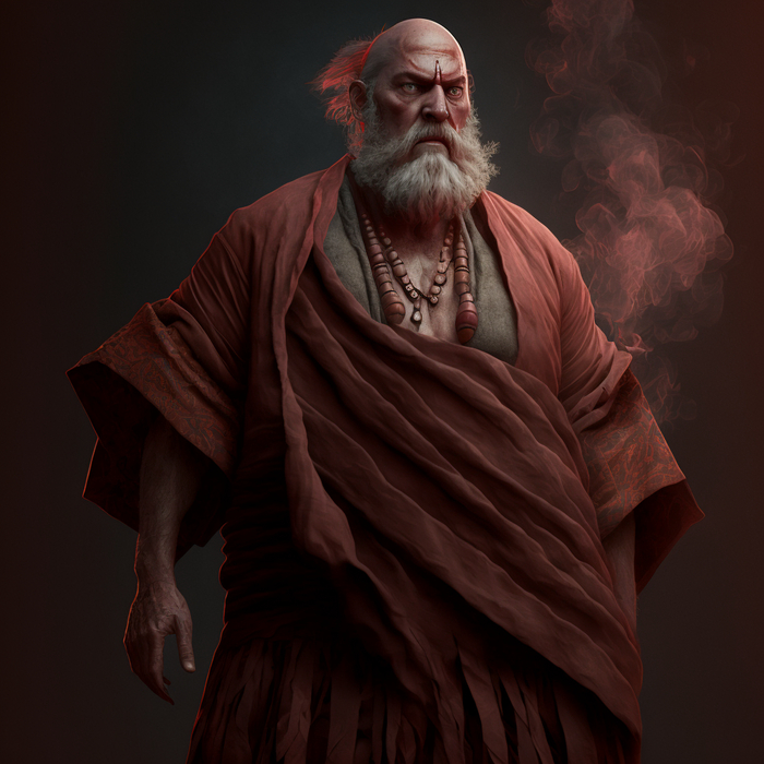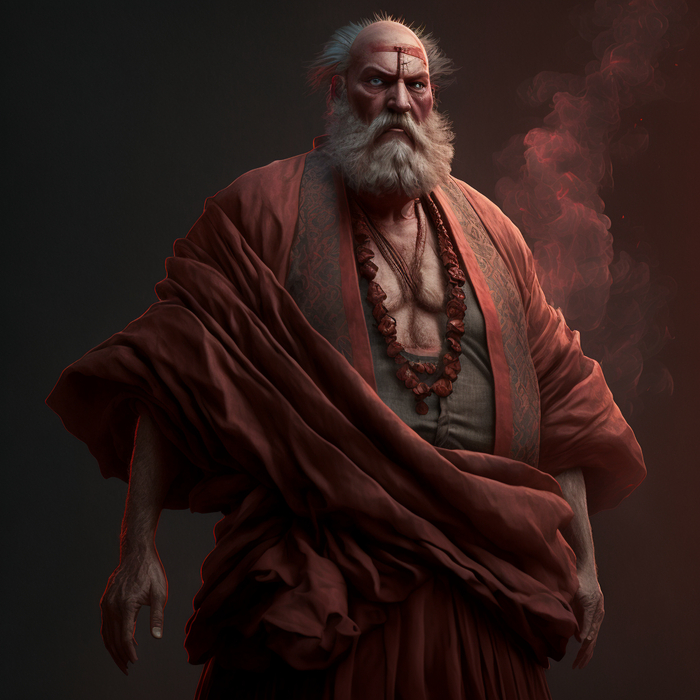"Male, Caucasian, Bearded, Giant, Crimson silk clothing, Large build, Heavy muscles, smoking, cigar, turban, approximately 50 years old, angry, long mantle, long poncho, long nightgown, hyper realism, highly detailed, Unreal Engine 5, octane rendering --no hood"