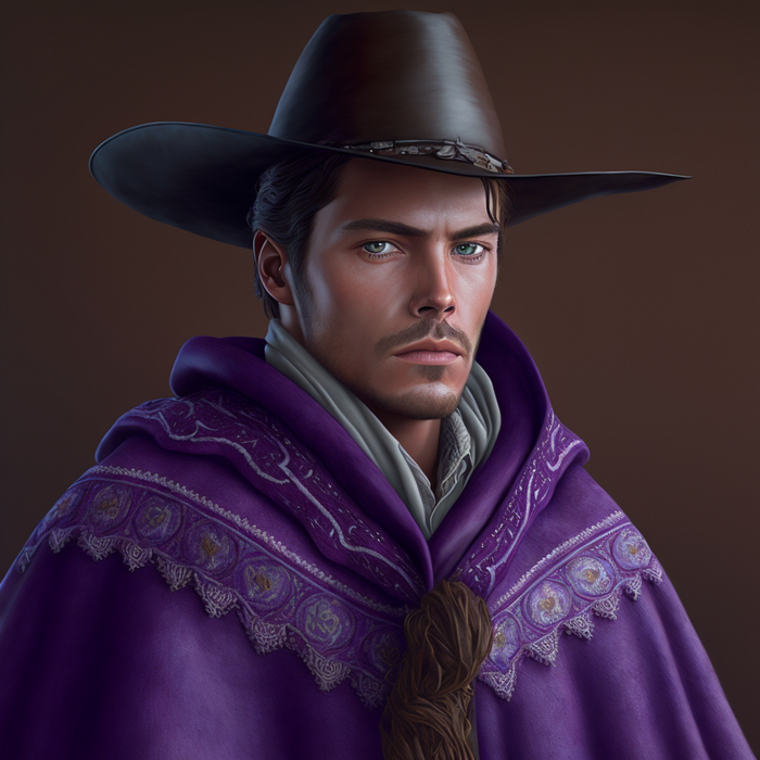 "Alain Delon, Young, approximately 30 years old, elegant purple mantle decorated with hand embroidery, elegant purple poncho decorated with hand embroidery, gray fedora, long mantle, long poncho, long nightgown, hyper realism, highly detailed, Unreal Engine 5, octane rendering --no beard"