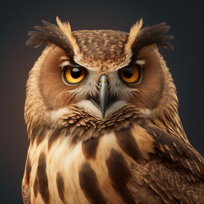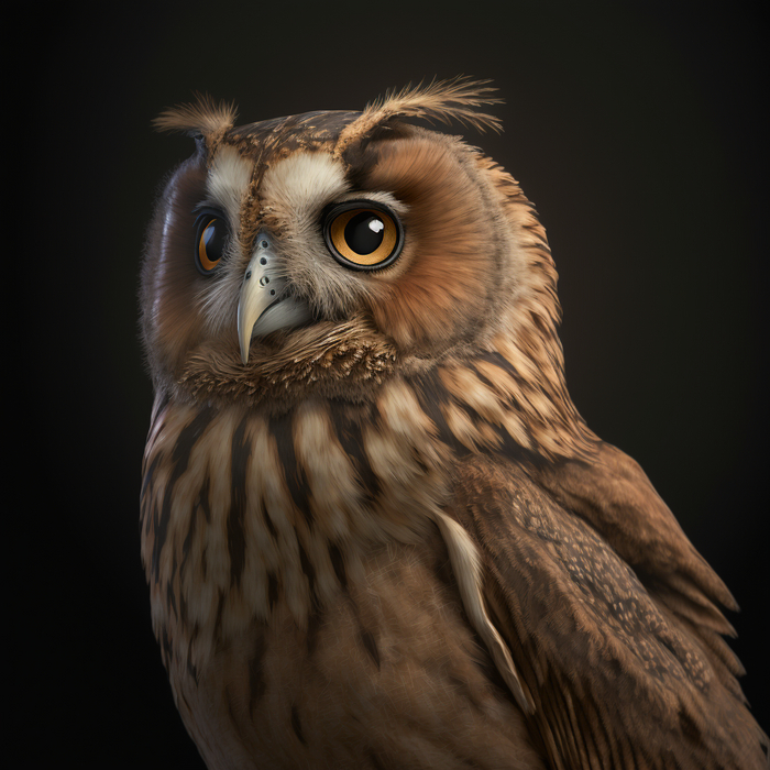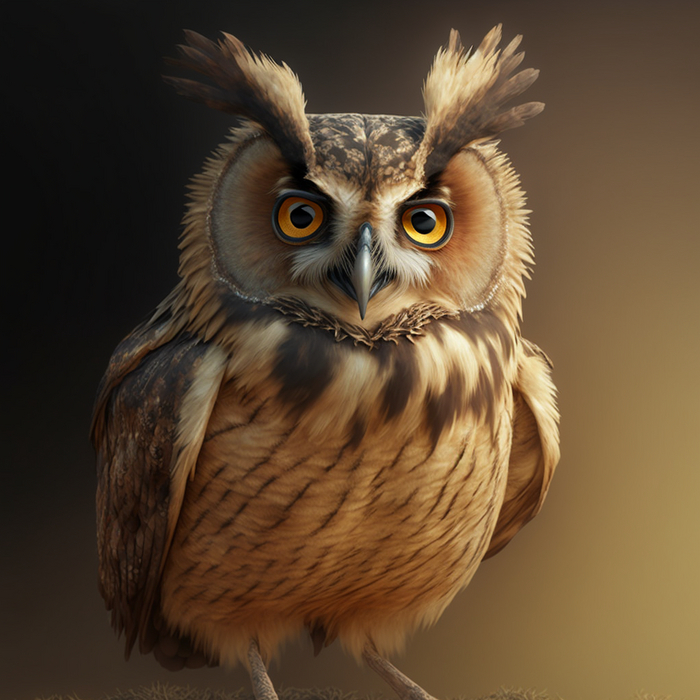 "Owl, Bird, Large, soft brown-yellow feathers, short thick beak, long feathery eyebrows rising high above eyes, hyper realism, highly detailed, Unreal Engine 5, octane rendering"