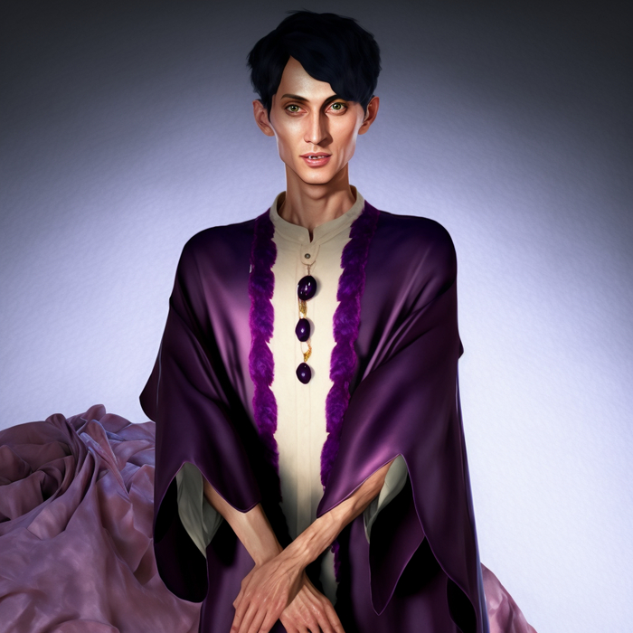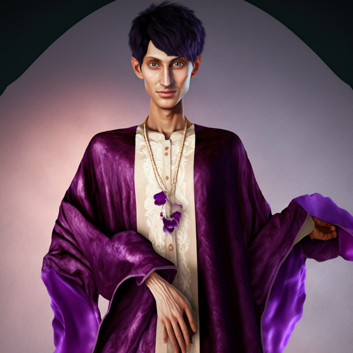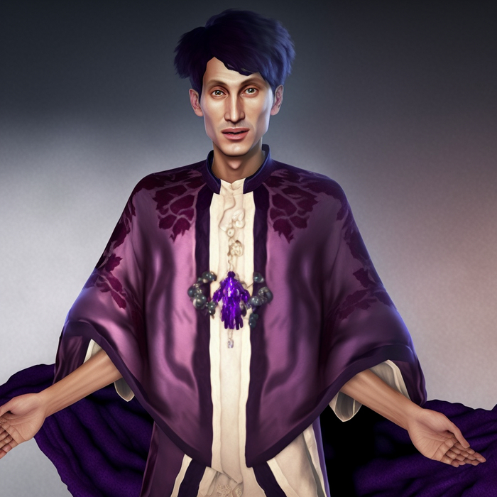 "Male, young, disproportionately long thin body, luxurious dark purple mantle, shy smile, very young face, long mantle, long poncho, long nightgown, turban, hyper realism, highly detailed, Unreal Engine 5, octane rendering --no hood --no beard"