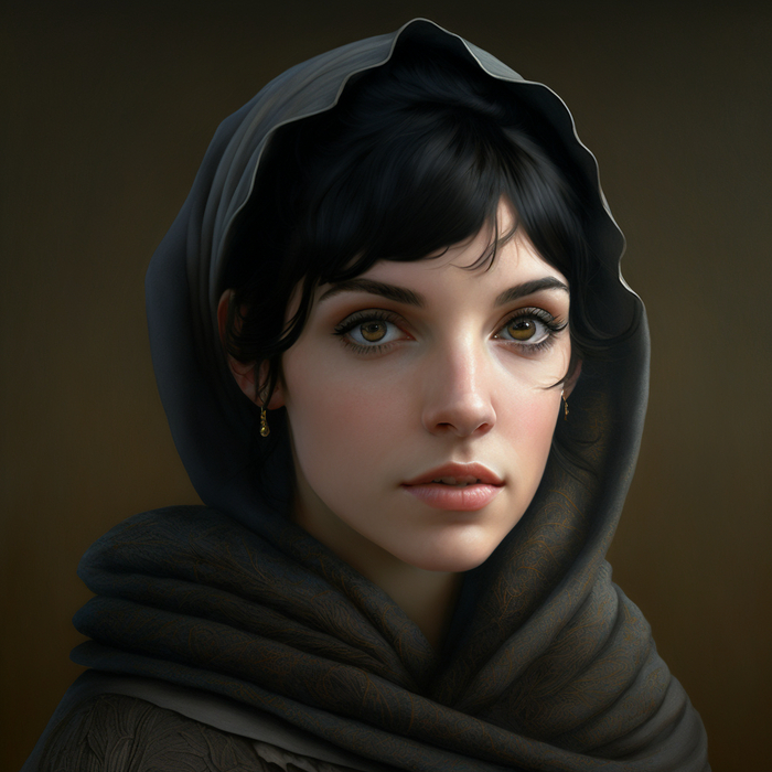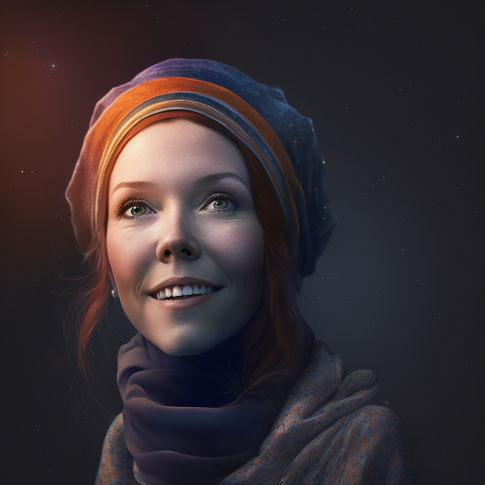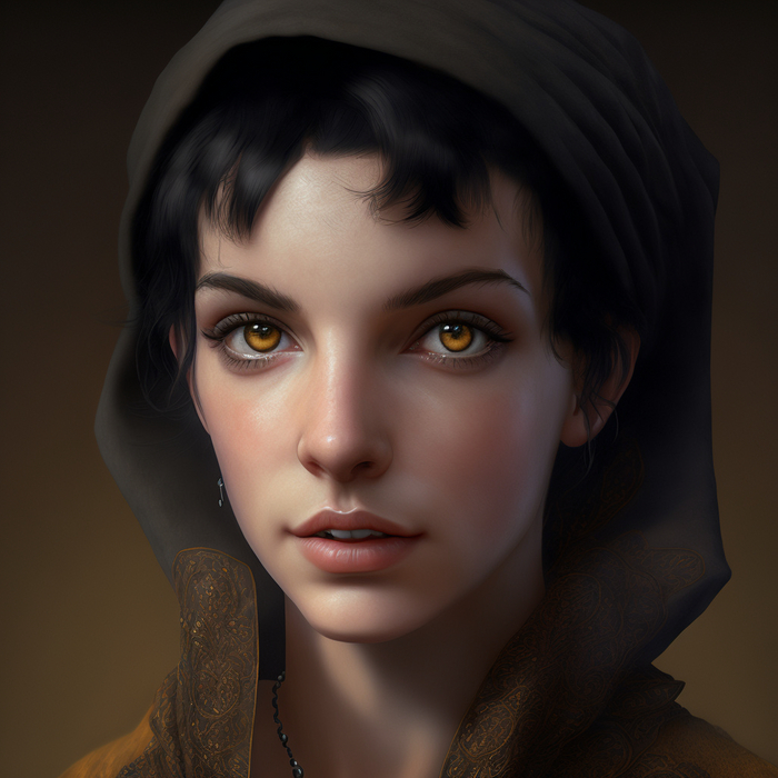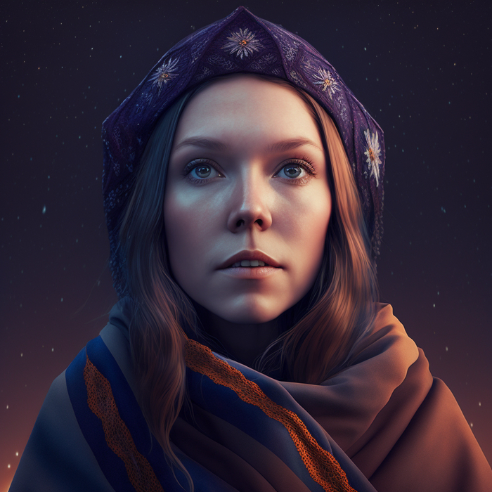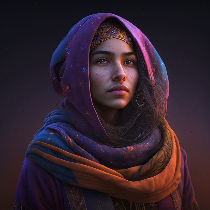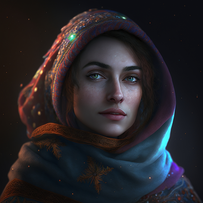 "Diana Rigg, Young, Short, Cheerful, Turban, Long Hair, night sky colored mantle, night sky colored poncho, approximately 25 years old, Unreal Engine 5, octane rendering, 1080p, Award Winning Photography, Super-Resolution, Ultra-HD, --no hood"