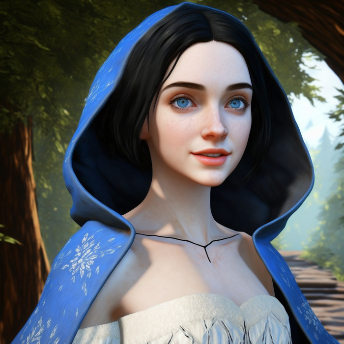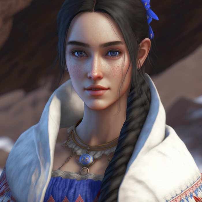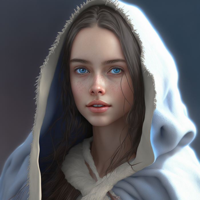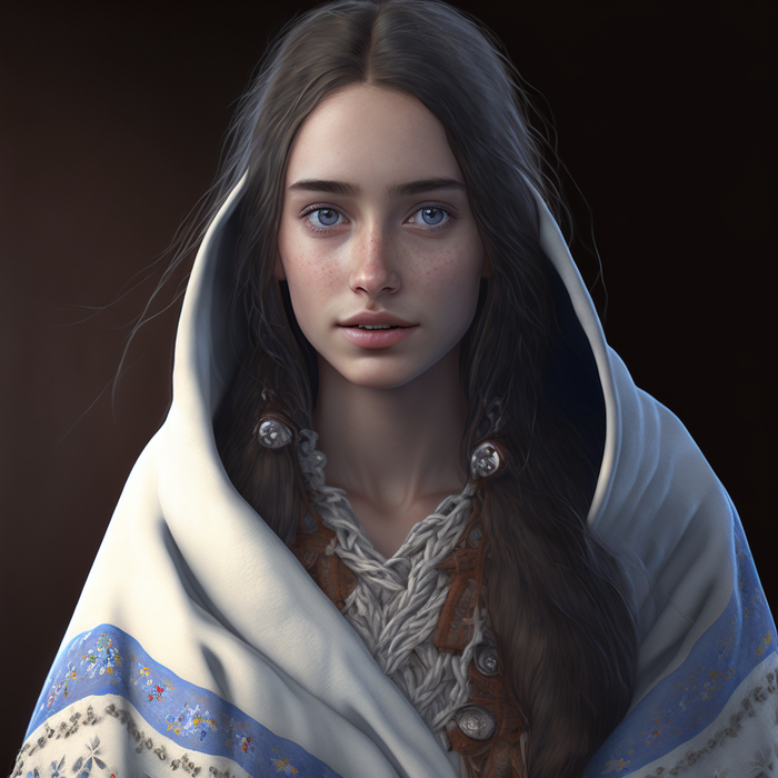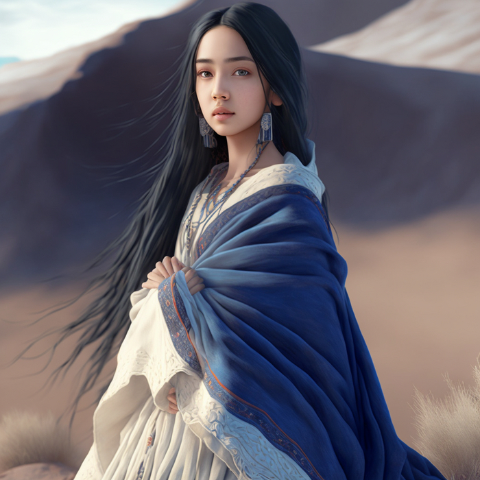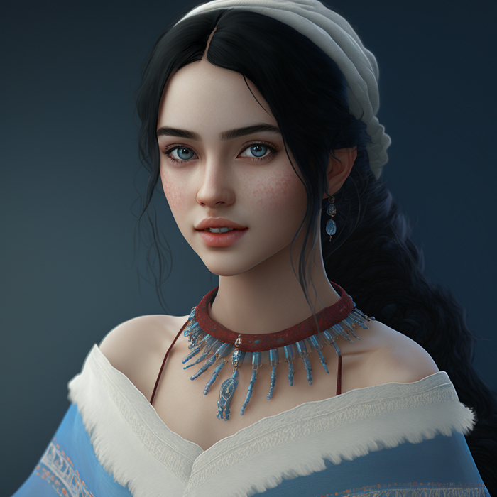 "girl, short, young, beautiful, approximately 16 years old, slim waist, d-cup, nice figure, bright black hair, long hair, incredibly long dark eyes, snow-white skin, smile, long blue and white mantle, long blue and white poncho, long nightgown, turban, hyper realism, highly detailed, Unreal Engine 5, octane rendering --no hood"