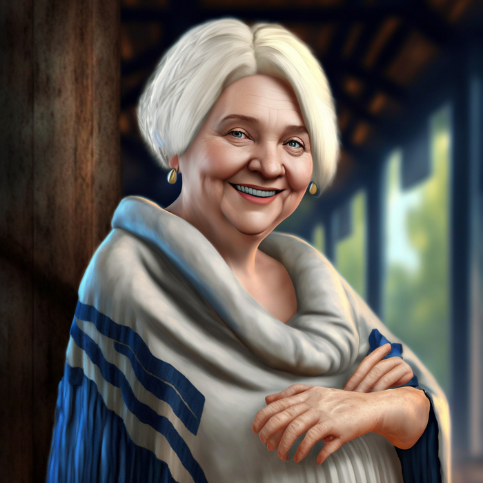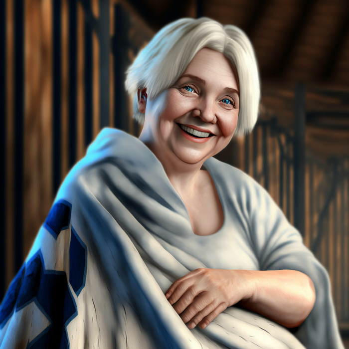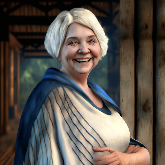 old woman, short, chubby, completely white-haired, friendly smile, long blue and white mantle, long blue and white poncho, long nightgown, hyper realism, highly detailed, Unreal Engine 5, octane rendering --no glasses