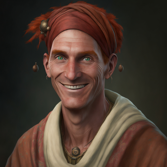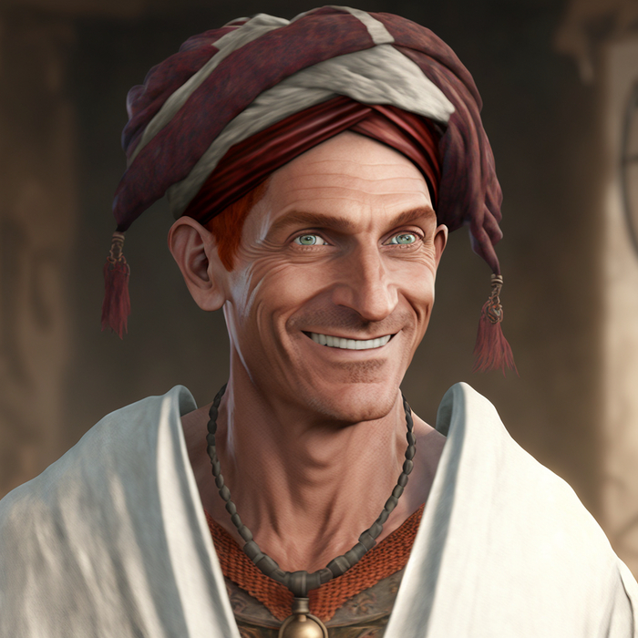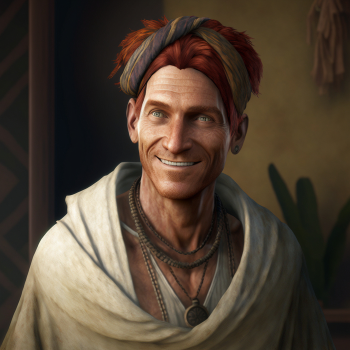 "male, caucasian, short, slim, red hair, long braid, approximately 45 years old, smiling, turban, clean-shaven, long mantle, long poncho, long nightgown, hyper realism, highly detailed, Unreal Engine 5, octane rendering --no beard"