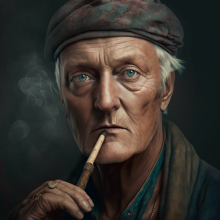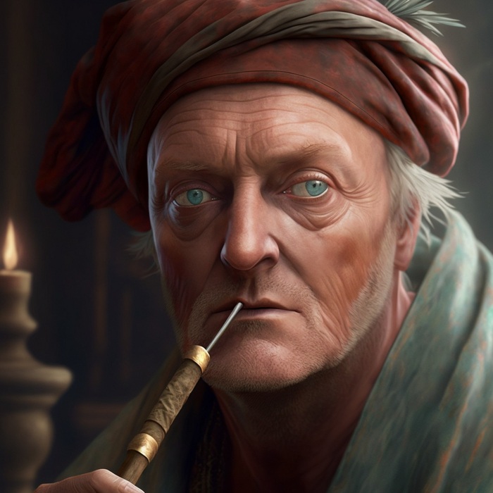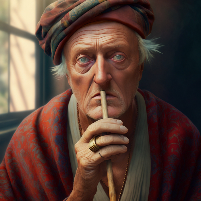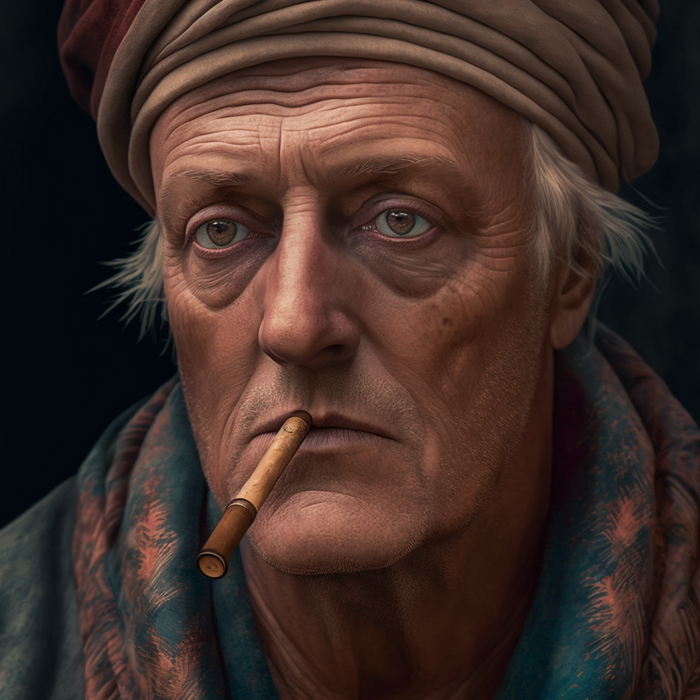 "Rutger Hauer, very bright eyes, slanted eyes, bald, turban, long mantle, long poncho, long nightgown, about 60 years old, smoking pipe, sly look, hyper realism, highly detailed, Unreal Engine 5, octane rendering --no hair"