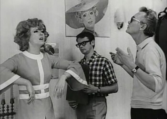 Евгений Леонов в роли Травкина и Светлана Светличная в роли работницы телевидения в фильме Георгия Данелия "Тридцать три", 1965 год.