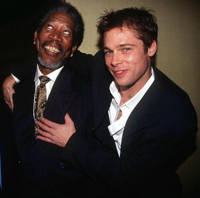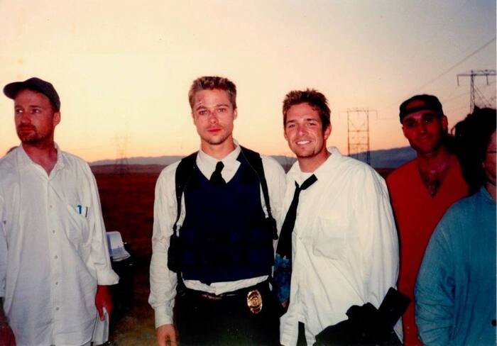 4) Закулисное фото со съёмочной площадки культового детективного триллера "Семь" (1995). Концовку с "сюрпризом" в коробке удалось воплотить благодаря Брэду Питту, подписанному на одну из главных ролей. Продюсеры студии настаивали на изменении сценария, чтобы не заканчивать фильм на столь мрачной ноте, тогда Питт начал угрожать увольнением, и всё оставили так, как изначально было задумано.