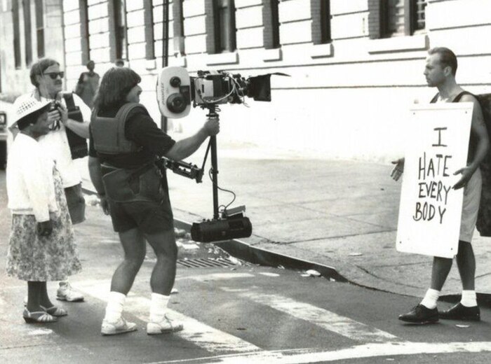 5) Брюс Уиллис на закулисном фото со съёмок боевика "Крепкий орешек 3: Возмездие" (1995). Всем известная коварная надпись на нагрудном плакате Джона МакКлейна была добавлена в итоговую версию фильма с помощью компьютерной графики.