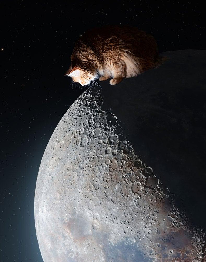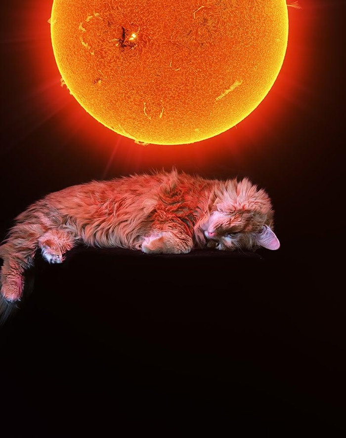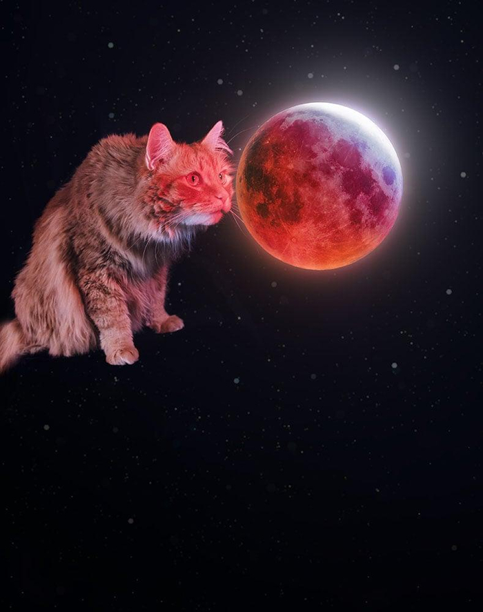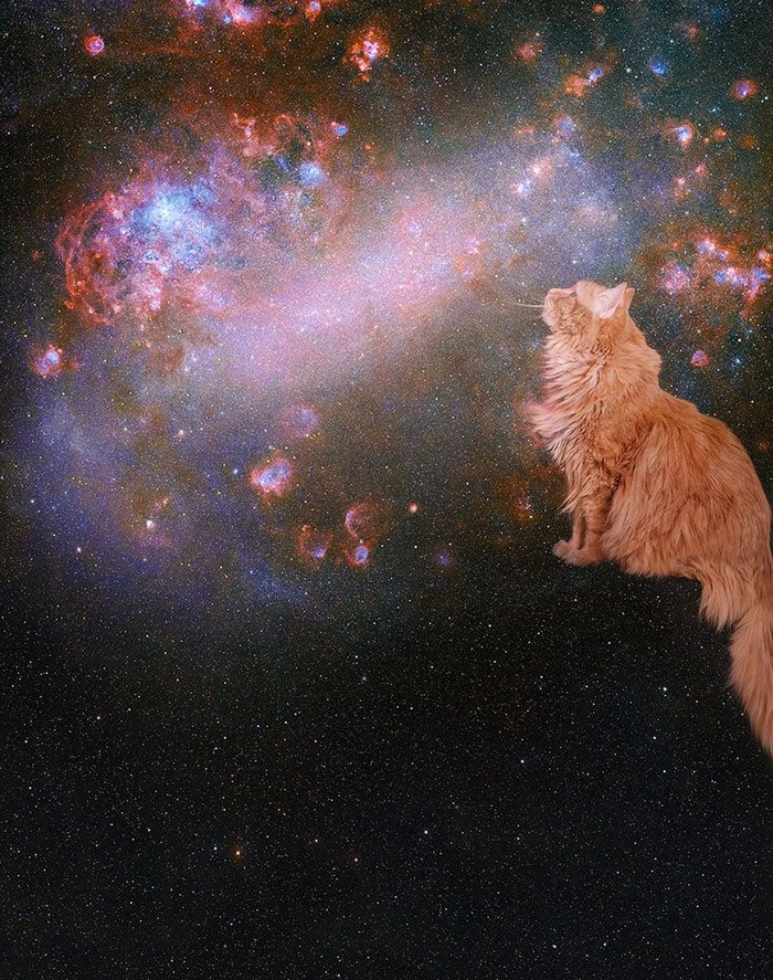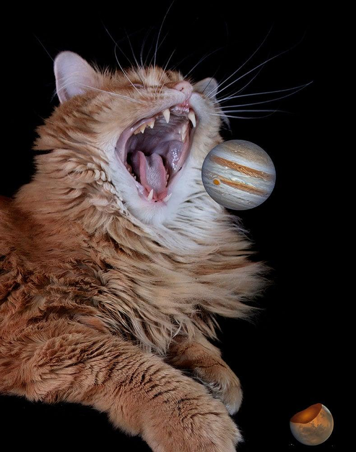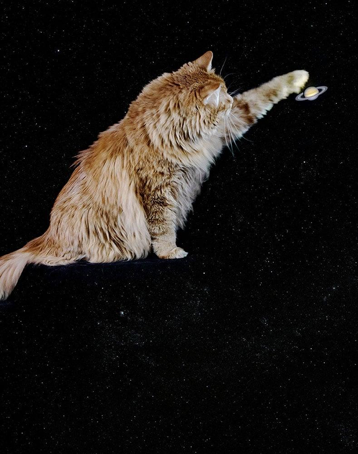 Известный американский астрофотограф Эндрю МакКарти регулярно радует любителей астрономии потрясающими кадрами. На сей раз МакКарти выступил в непривычном для себя жанре — фотограф сделал серию портретов своего рыжего кота по кличке Грегори, а затем совместил их со своими снимками Солнечной системы и далеких космических объектов.