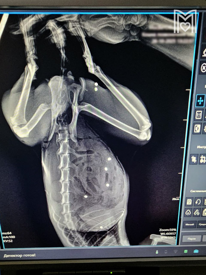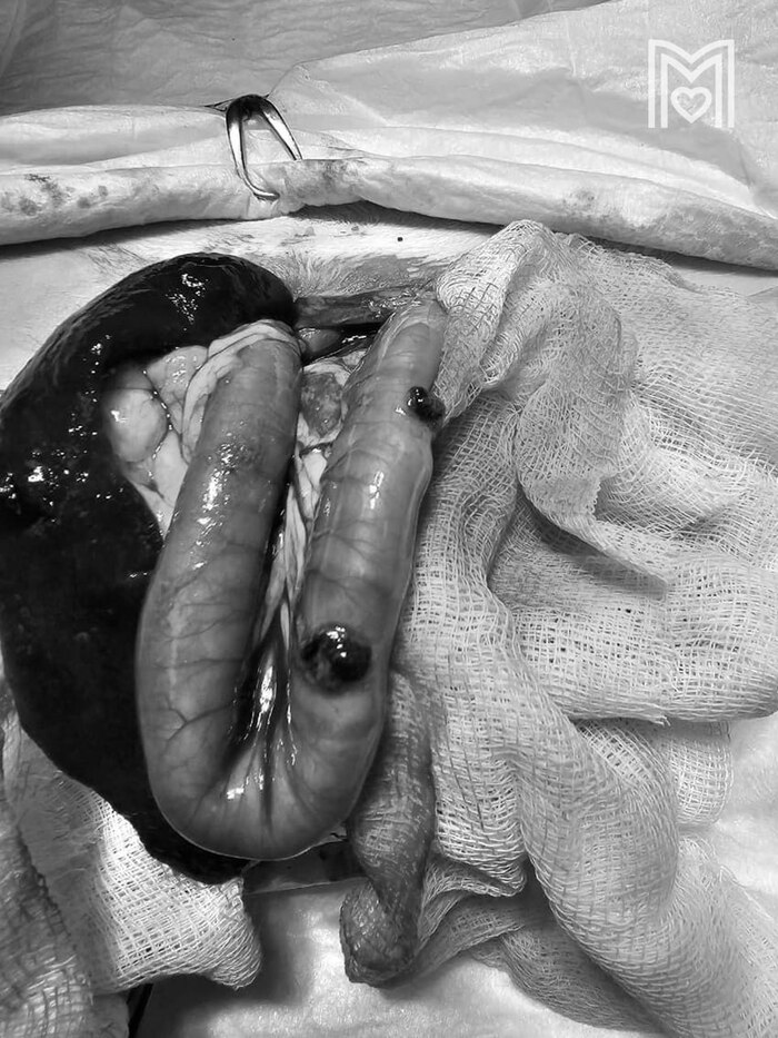 5-летний кот Тимофей был доставлен к хирургуЕвгению Александровичу Цыбину. Выяснилось, что у животного пробит кишечник в 24-х местах и в двух местах — селезёнка, также пули попали в грудную клетку и мышцы бедра.