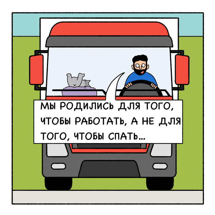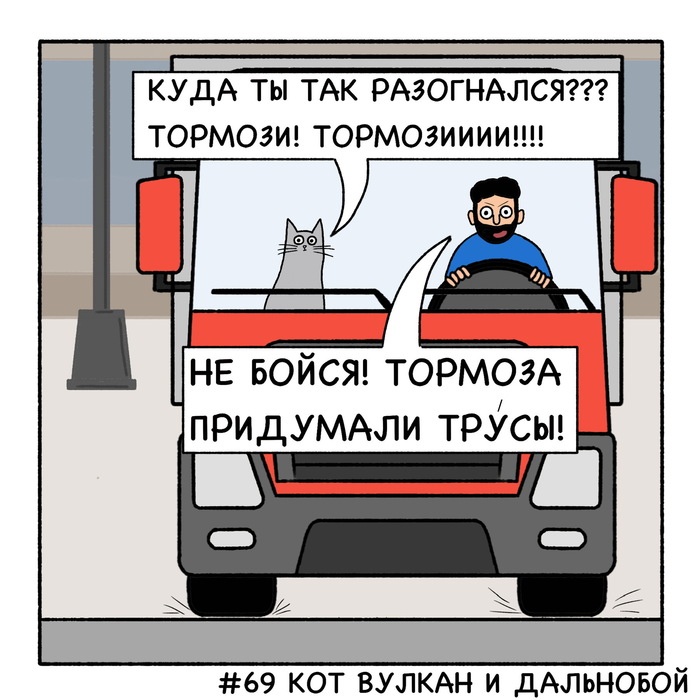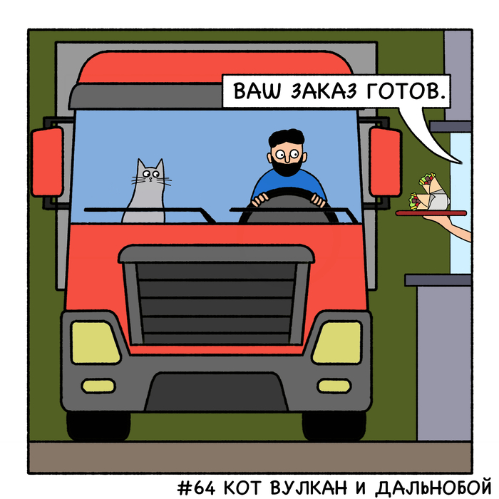 Кот Вулкан и дальнобой едут далеко-далеко. В дороге дальнобоя развлекает очень эрудированный и умный кот Вулкан.