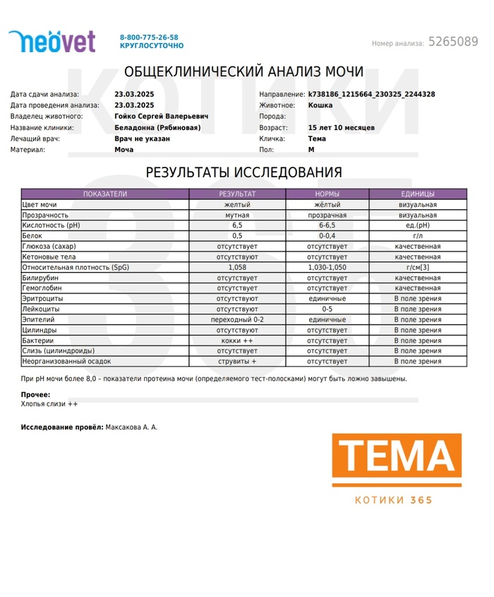 По моче. Кислотность на верхнем пределе. Но не критично. Наличие небольшого количества струвитов, вероятно, обусловлено высокой плотностью мочи,. Поэтому рекомендовано увеличить потребление жидкости или делать подкожные инфузии. Мы будем делать инфузии.