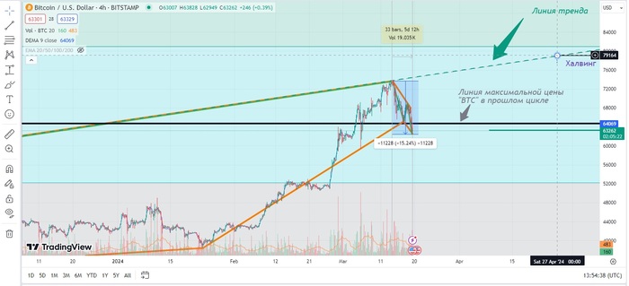 За 5 дней цена упала на 17% с 73718 USDT до 60774 USDT.