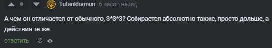 Все "инструкторы" и сайты "по сборке" говорят о некой связи с кубиком 3х3х3. И опять же НО... У кубика 3х3х3 есть несколько универсальных способов сборки с чёткими формулами приведения к требуемому результату. НО! Ни один послойный метод сборки кубика 3х3х3 нельзя применить к кубику 7х7х7... Совершенно другие математика и геометрия... Единственная связь - это использование формул перемещения и замены угловых кубиков в конце сборки. Но и это практически неочевидно из-за модификации формул под кубик 7х7х7...