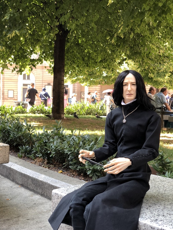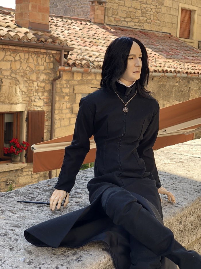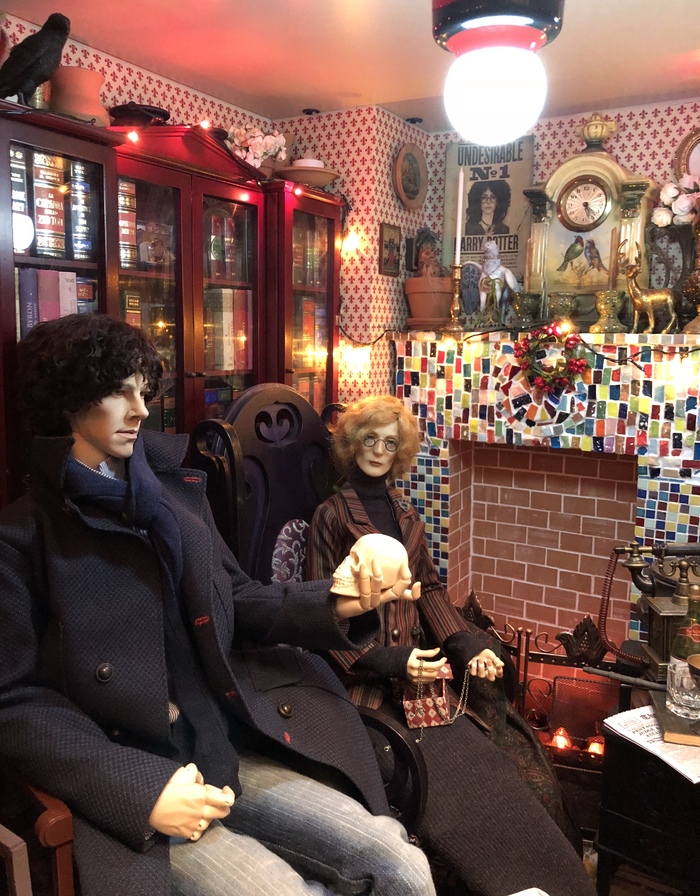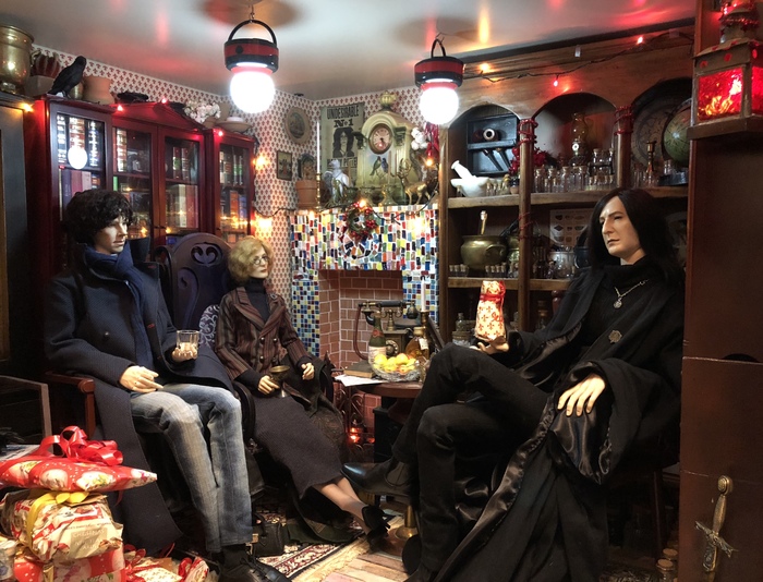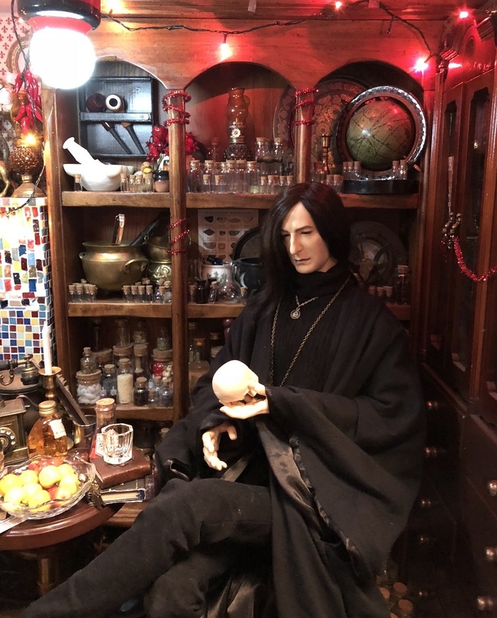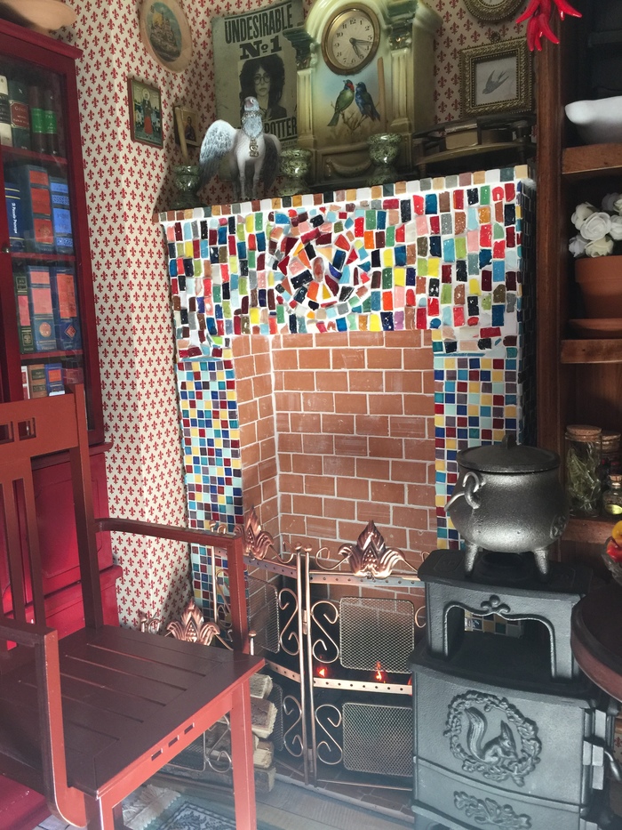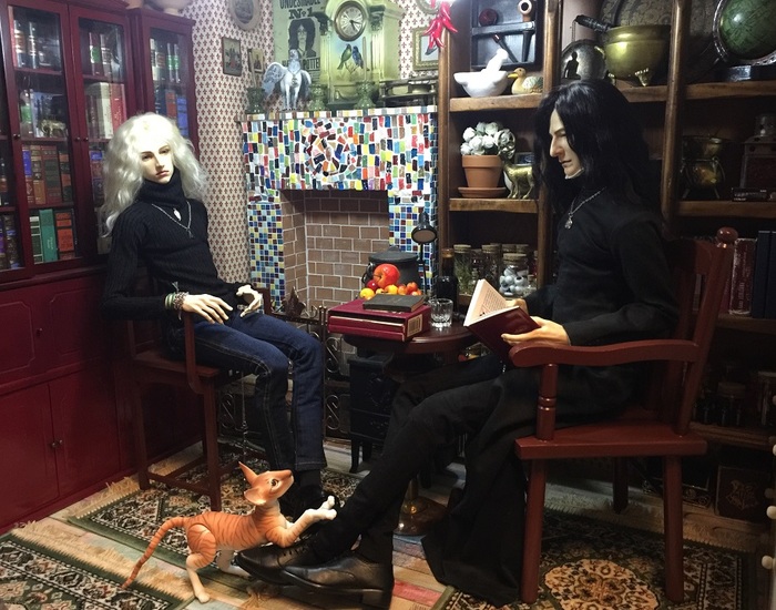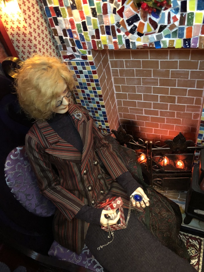 Журнальные столики на втором этаже - у телека сделан из куска от ножки от шкафа, у камина шкатулка, подруга подарила, я вырезала стекло для столешницы, а крышку от этой шкатулки поставила на чердак профессору Макгонагал, там на ней сверху торчит зачотный конь.