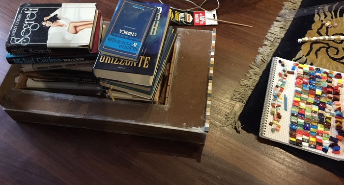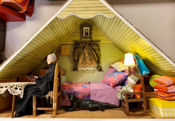 На чердаке кровать сделала из картона, дерева и кусков металлического стеллажа для вывешивания сережек, самое сложное было эти гребаные стеллажи распилить.