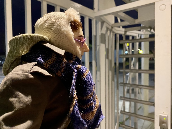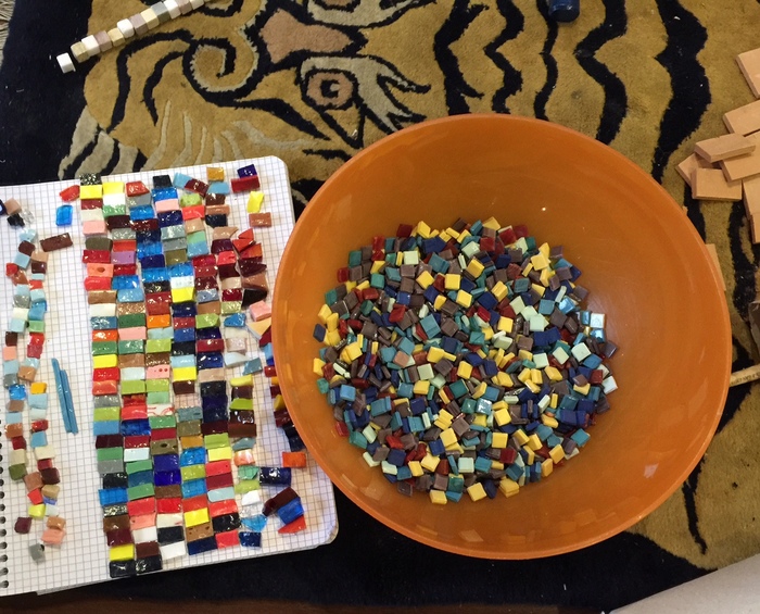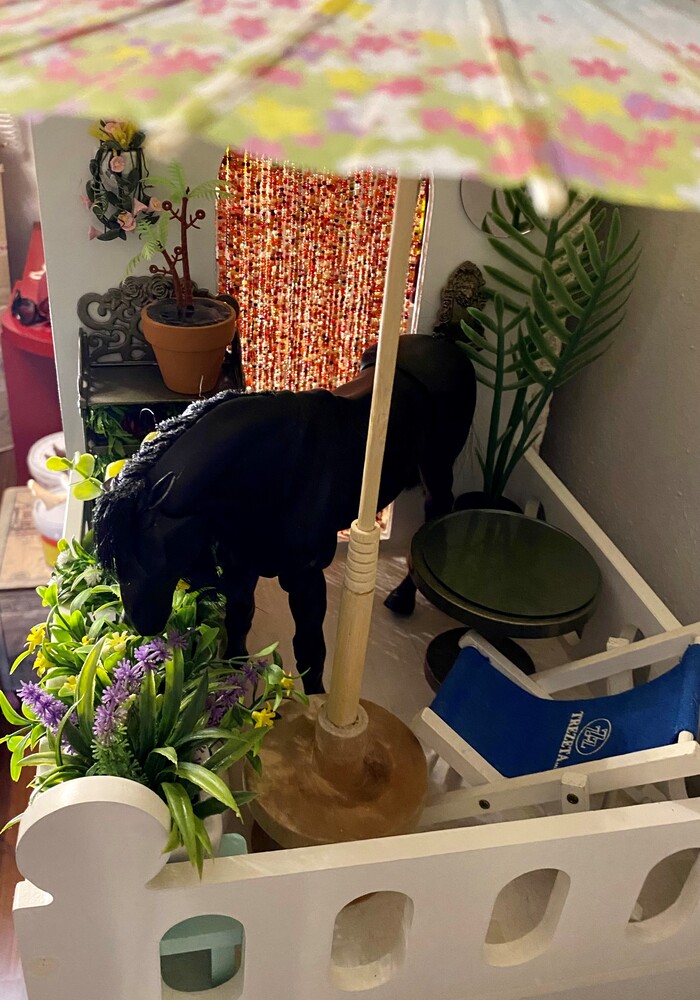 Кровать - мини паллеты, типа подставки под стаканы. На балконе шезлонг сперла у коллеги, это подставка под телефон, зонтик китайский, поставила его на кусок от ножки для шкафа. Балконный пол выложила из мраморной мозаики, чтоб вреалистично.