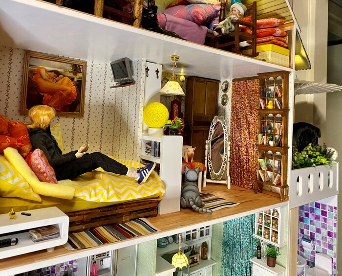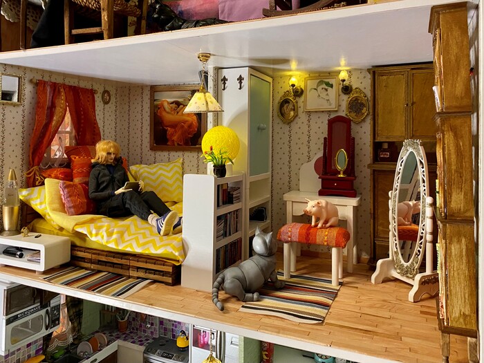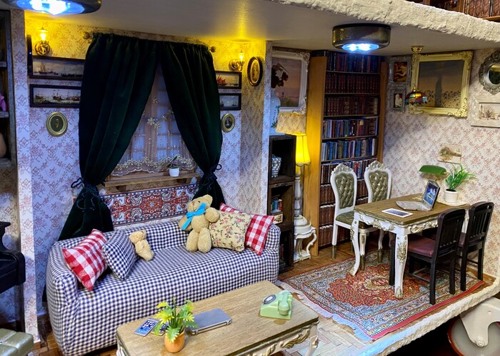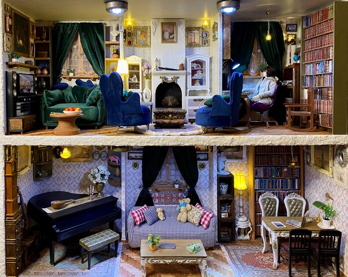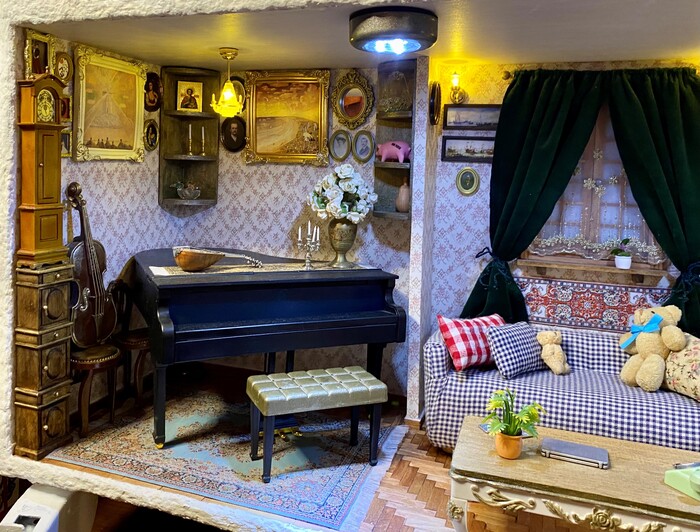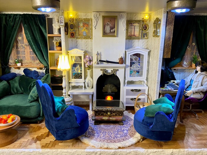 Мебель частично с али, барбеевская перекрашеная и долепленая самозастывайкой для устойчивости, частично сделала из картона (коллега подогнала обрезки шикарного плотного картона из типографии, ужасно пригодились, большое ей спасибо!), деревянных обрезков и из говна и палок) Камин тоже из этого, на каминную арку пошел кусок дерева из коробки для вина, там как раз для крепления бутылки удачный вырез был. Диваны сама ваяла, синие кресла - китайские шкатулки для бижутерии.