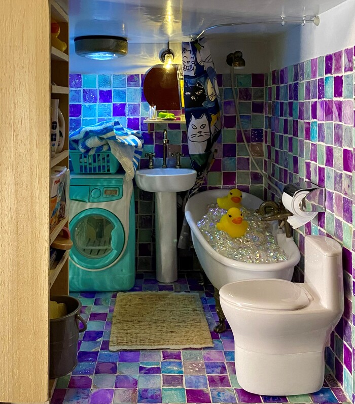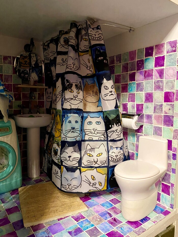 Ванна барбеевская, только поставила ее на железные ножки и долепила, и слепила кран и присобачила душ на стену как полагается. Унитаз - аудиоколонка для телефона, долепила до нужной высоты. Там еще сзади ершик для унитаза не видно, на днях сделала из щеточки для туши и колпачка от ручки) Зеркало, как и пара других - из старых пудрениц. Пена в ванной - бусины с али. Шторка для ванной из сумки для покупок, котики очаровали. Раковину поставила на бумажную втулку от полотенец и заполнила цементом чтоб не падала, сама раковина - магнит для скрепок в офисе.