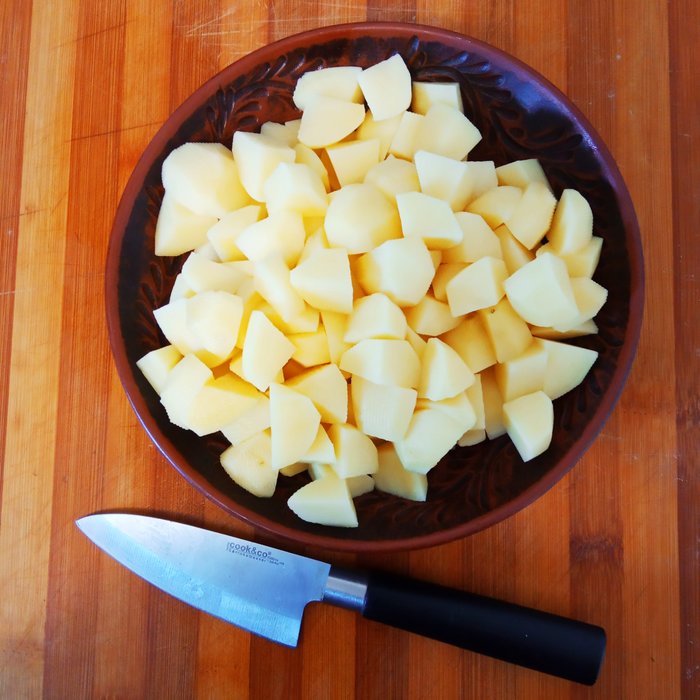 Картофель сварить. Согласно распространённому в сети тексту – в мундире, дабы он "не впитал воду». Я варил на пару, очищенный и нарезаный крупными кусками. Потому что так мне намного удобнее. Размять в пюре.