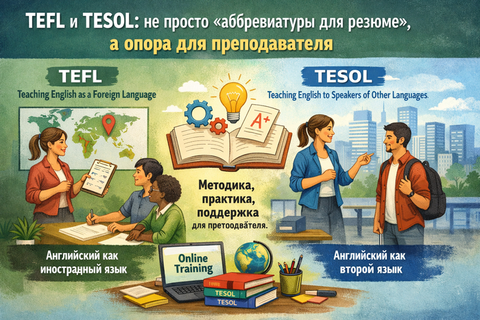 TEFL обычно читается как Teaching English as a Foreign Language — то есть когда английский для ученика не язык среды. TESOL (Teaching English to Speakers of Other Languages) шире: английский как второй/дополнительный язык, часто с фокусом на разноуровневые группы и мультикультурный контекст. На практике разница ощущается не в названии, а в том, какие сценарии вы отрабатываете: уроки онлайн, дети, взрослые, корпоративные группы, экзамены.