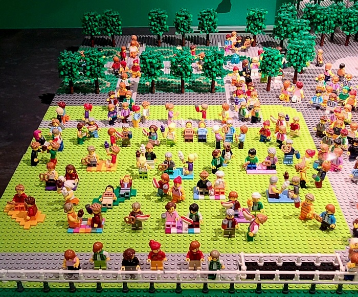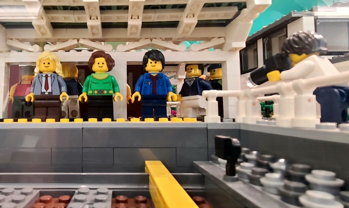 Сразу под входом в бункер расположены жилые помещения. Идея с синими торсо, имитирующими одежду жителей убежища, откровенно скопирована из других (в том числе оригинальных) лего-наборов, но смотрится все равно стильно. Телевизор, как по мне, сделан не совсем удачно, больше похож на ретро-микроволновку (но я и так не сделаю, так что идем дальше)