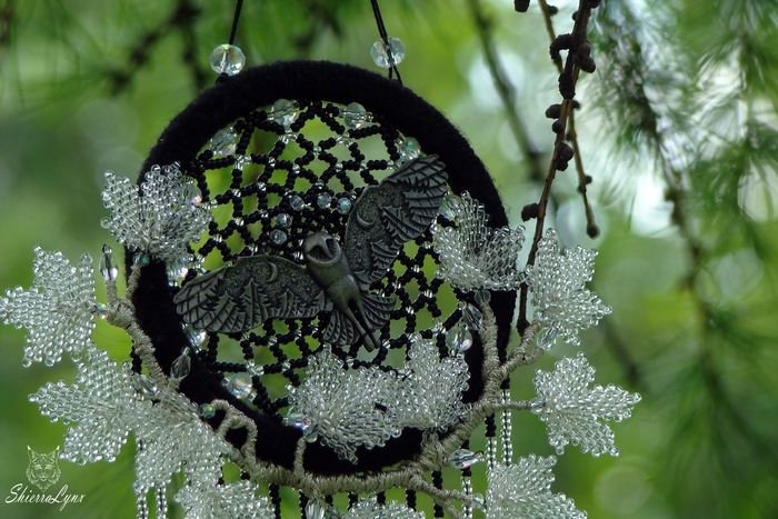 Получается, что сетка внутри ловца - ажурный витраж. С помощью бисерной паутины и различных бусин складывается стеклянный рисунок.