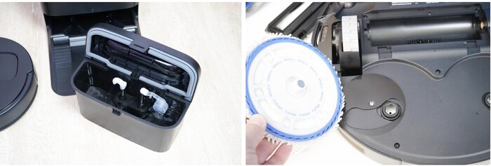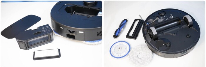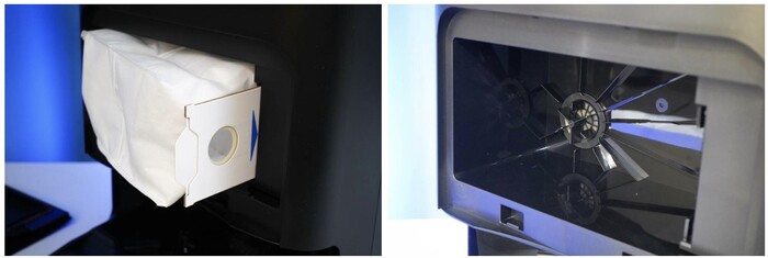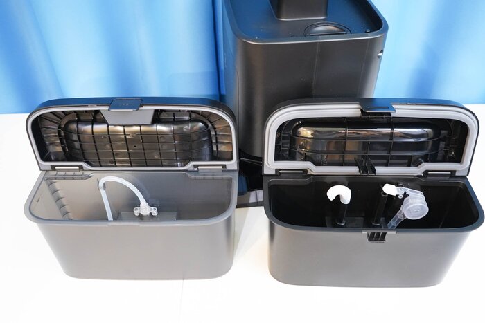 Если заглянуть под верхний блок, то можно обнаружить внешнюю помпу, которая поднимает воду на ультразвуковой датчик и керамический фильтр. В самом блоке размещается еще один фильтр из камня майфан. Воду можно заливать как в сам бак, так и через верхнюю крышку. Керамический фильтр смягчает воду, и во время работы на поверхностях образуется значительно меньше белого налета. А еще внутри корпуса размещается УФ-лампа, которая уничтожает различные бактерии и вирусы.