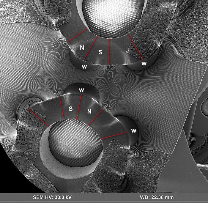 На видео показано визуализация взаимодействия магнитных колец в муфте в сканирующем электронном микроскопе при помощи западных магнитных полюсов.
