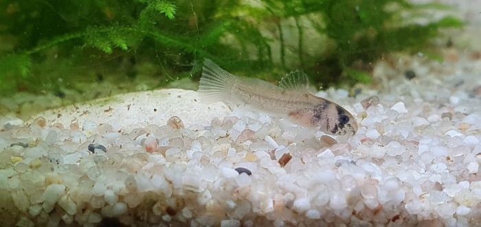 На этой фотографии сомик из первой кладки. Уже выглядит как взрослая особь только очень маленькая.