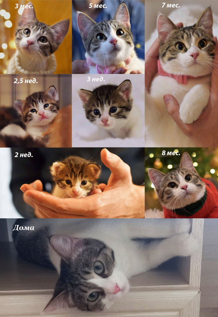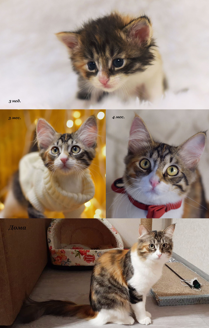 На первом коллаже Ириска. Она единственная пока не нашла дом. Ириска невообразимым образом сочетает в себе милашность и наглость. Она очень общительная, любит и котов, и людей, неимоверно нуждается в ласке и внимании, часами сидит на коленях, с радостью катается по дому под мышкой, как собачка, становится на задние лапы и просится на руки, соскучившись, трогательно обнимала и вылизывала братьев и сестер, пока они еще жили у нас. В общем, прелестнейшее создание, особенно с учетом ее миниатюрности и взлохмаченности, как у воробушка.