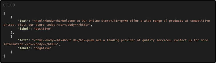 Для обучения модели нужно подготовить набор данных, который будет содержать примеры веб-страниц, как магазинов, так и не магазинов. Каждая запись должна включать текст страницы и соответствующую метку (positive для магазинов и negative для не магазинов).