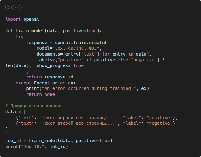 После токенизации текста можно отправить данные для обучения модели OpenAI. Вот пример кода для отправки данных: