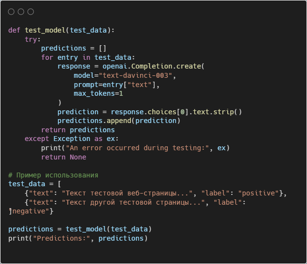 После обучения модели необходимо протестировать её на тестовом наборе данных. Вот пример кода для тестирования: