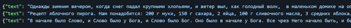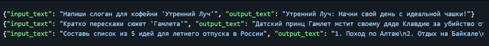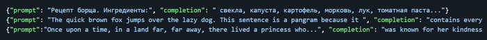 Каждый JSON-объект (каждая строка в файле .jsonl) обычно содержит пары "вход" -> "ожидаемый выход".