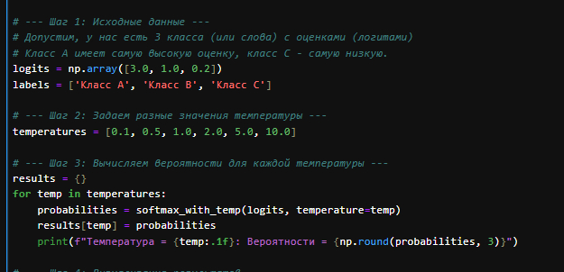 Пример наглядно показывает, как параметр температуры τ позволяет контролировать "уверенность" или "случайность" выбора в функции softmax.