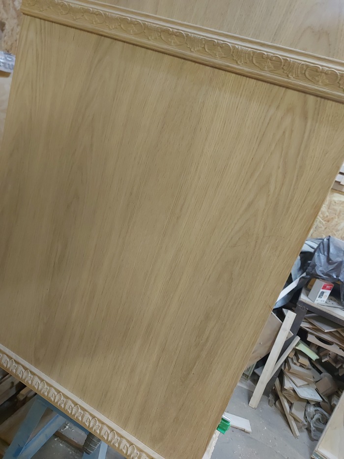 По периметру декорирован обьемными дубовыми рейками выполнеными на ЧПУ.