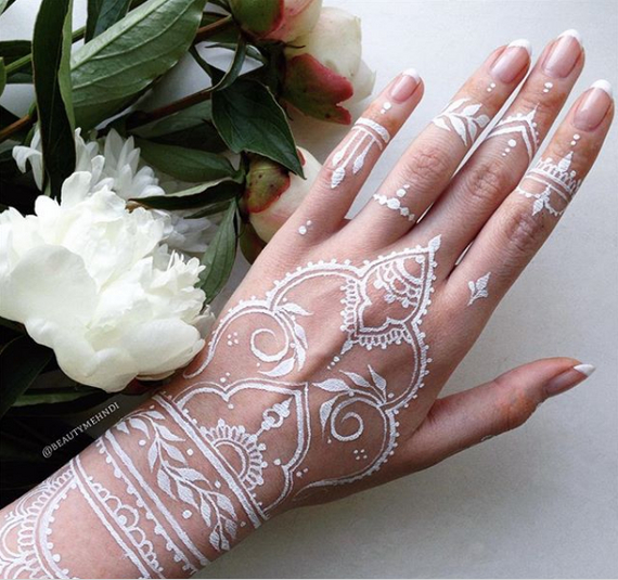 Белый - так белый. Пожали наши, местные мастера плечами и стали подстраиваться под наши, местные традиции. Боди-арт , говорите? Ну, чтож. Где там красочки , чтоб заместо холста на людЯх рисовать? Берём такую красочку, белую, на этиловой базе ( это важно!). Переливаем эту красоту белую в конус , такой же как для джагуа или хны. С дырочкой только аккуратно - краска таки жидковата по сравнению с той же хной… Ну и рисуем невесте весь этот кружевной ансамбль той же техникой, но другим средством.