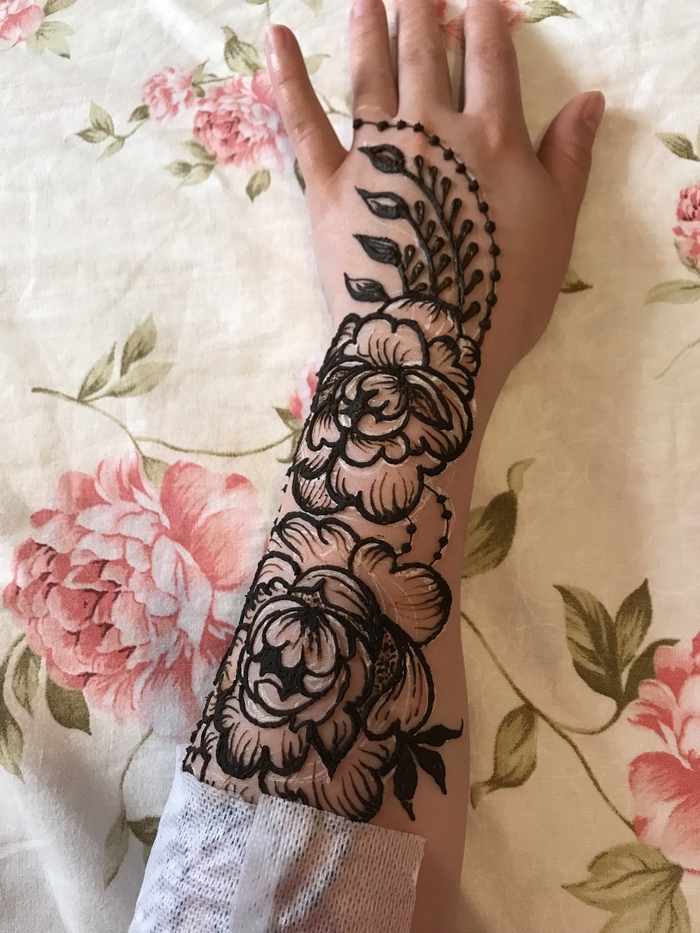 Я предпочитаю заклеивать обычным фиксирующим медицинским пластырем. Так что визуально от меня все выходят с тяжкими телесными как минимум, как мумии - как максимум. Однако считаю это наиболее удобным и практичным ( это если у вас нет аллергии на пластырь, а то и такое случается) - рисунок зафиксирован, движений бояться не нужно, одевайся-раздевайся, прыгай , бегай, занимайся йогой. Мочить только не надо. В смысле, водой. А то растечется и размочится вся эта хна даже под вашим пластырем, и будет у вас не гжель восточной интерпретации , а рыжее пятно.